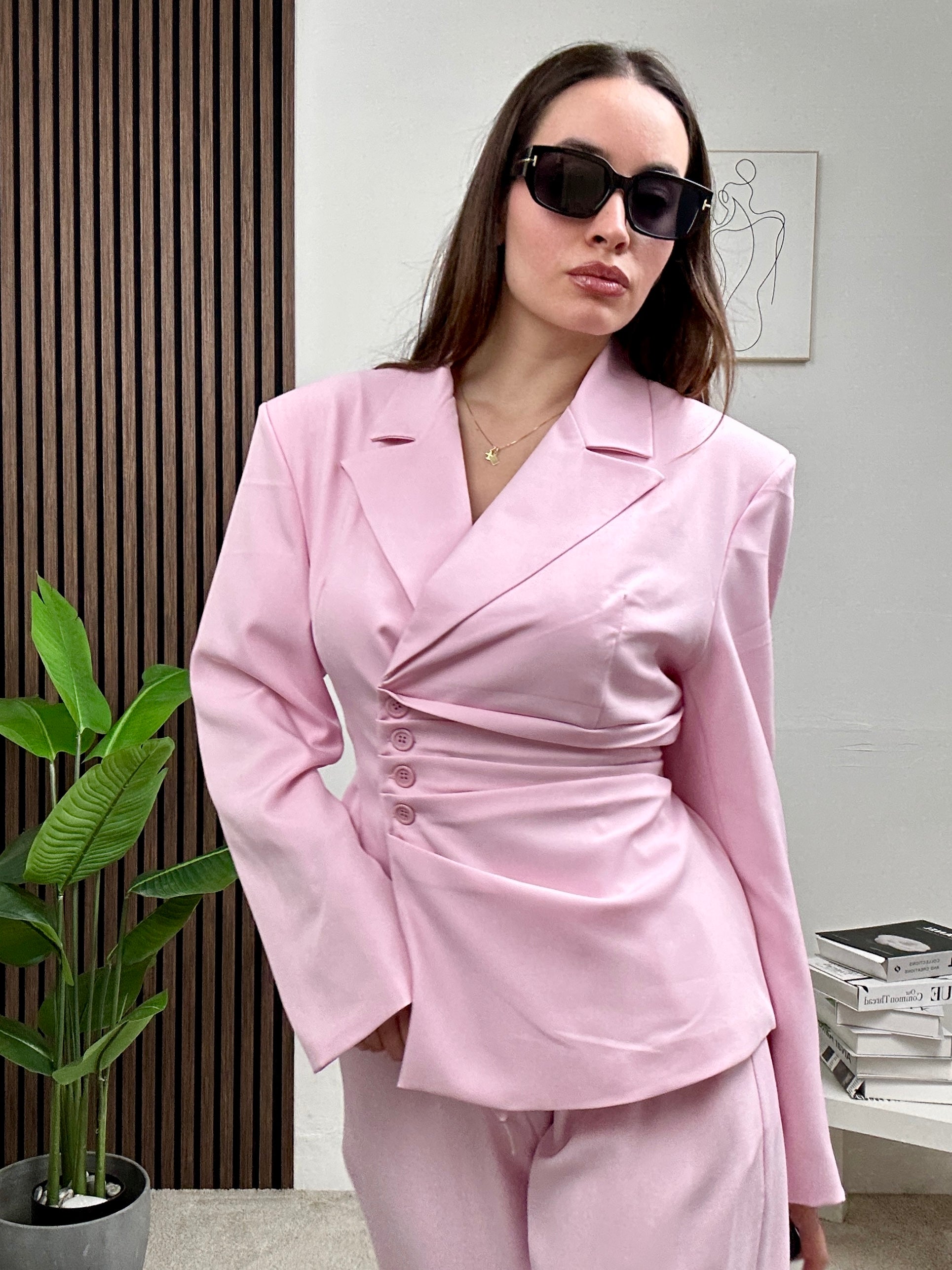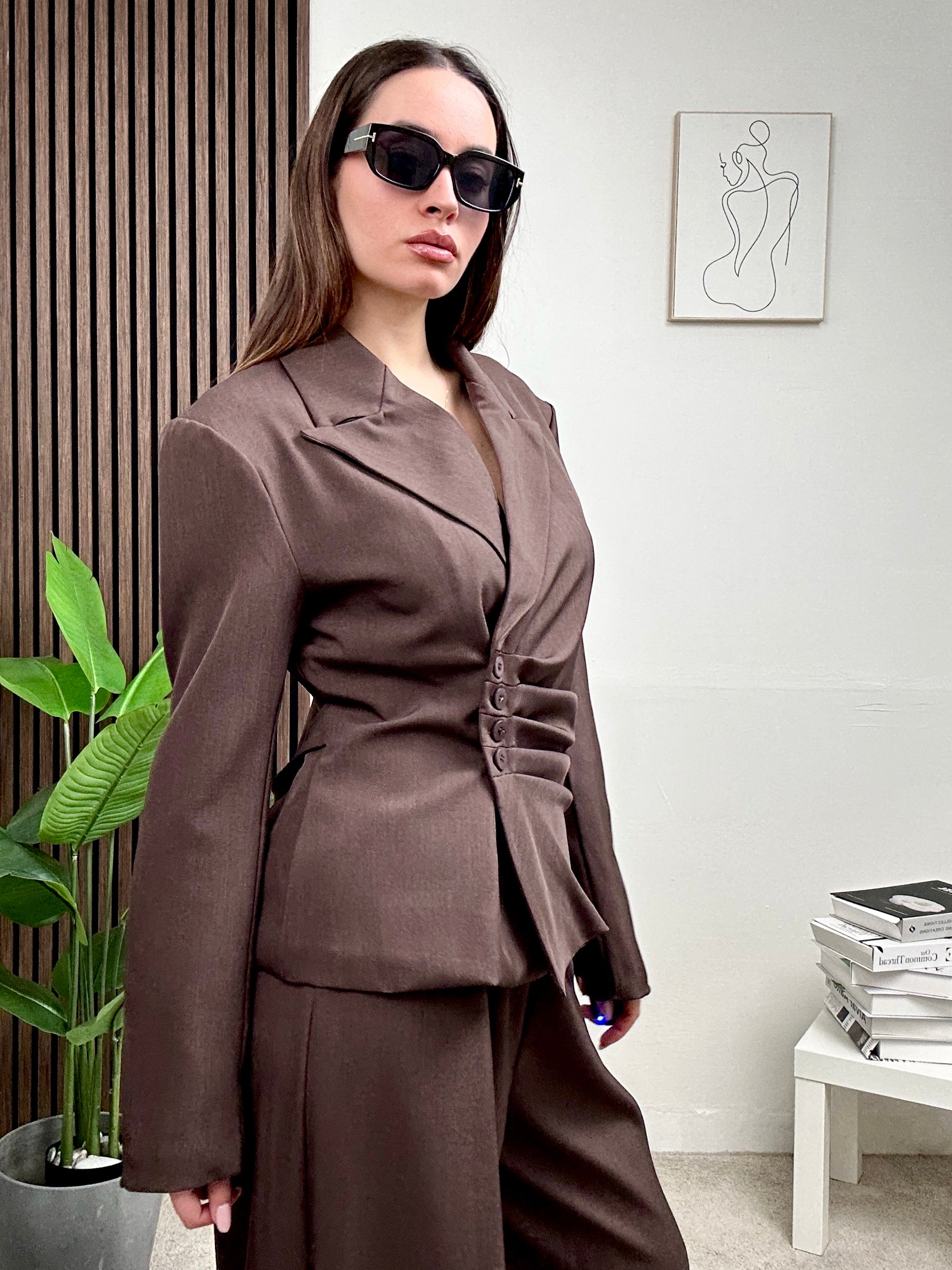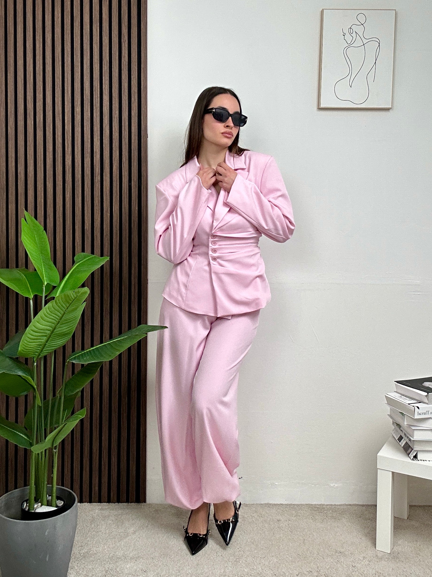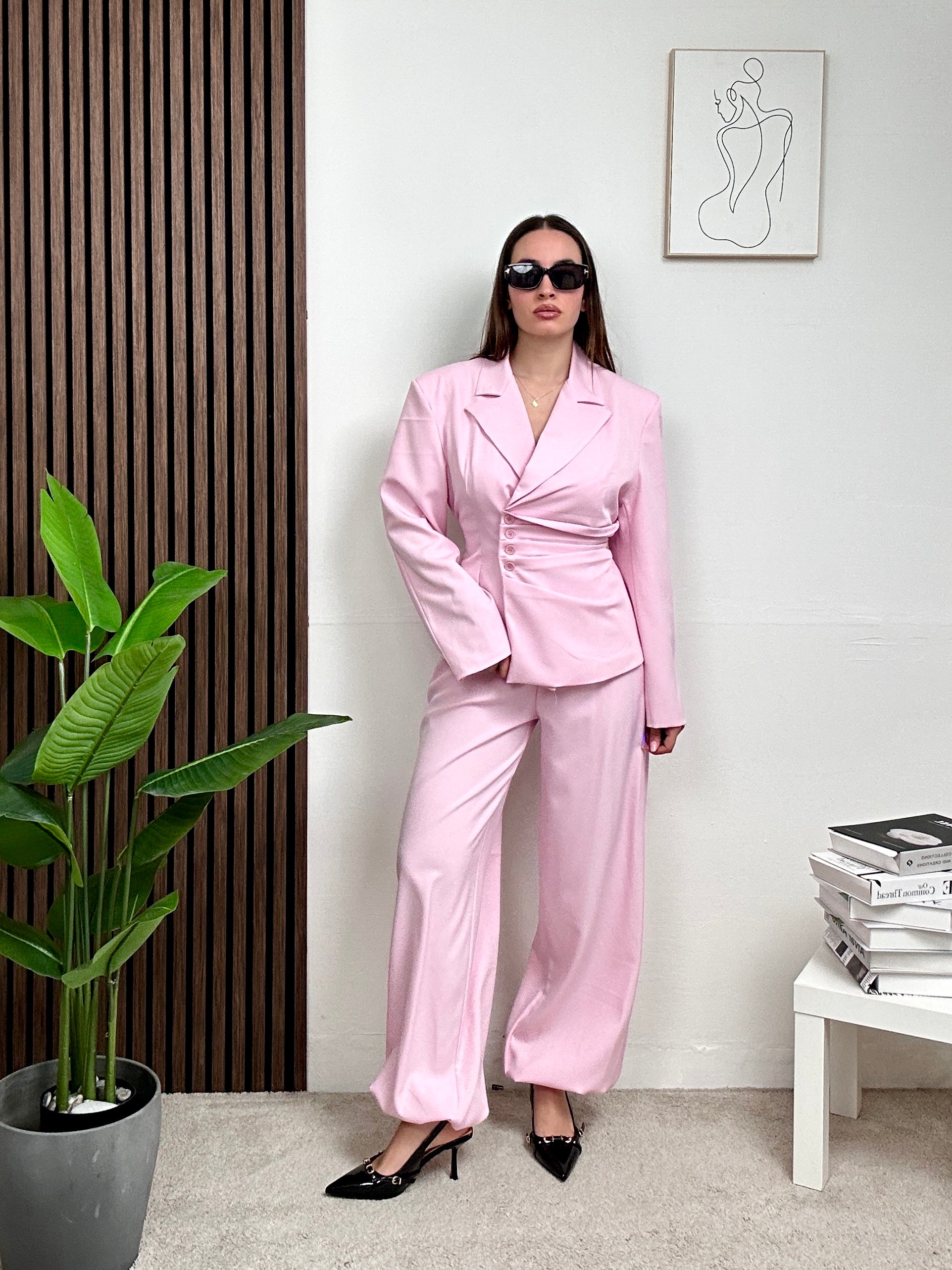 Completo composto da blazer strutturato con chiusura frontale e pantalone ampio a vita alta. Linee pulite e taglio sartoriale per un look sofisticato e contemporaneo. Perfetto per occasioni formali o outfit eleganti dal carattere deciso.