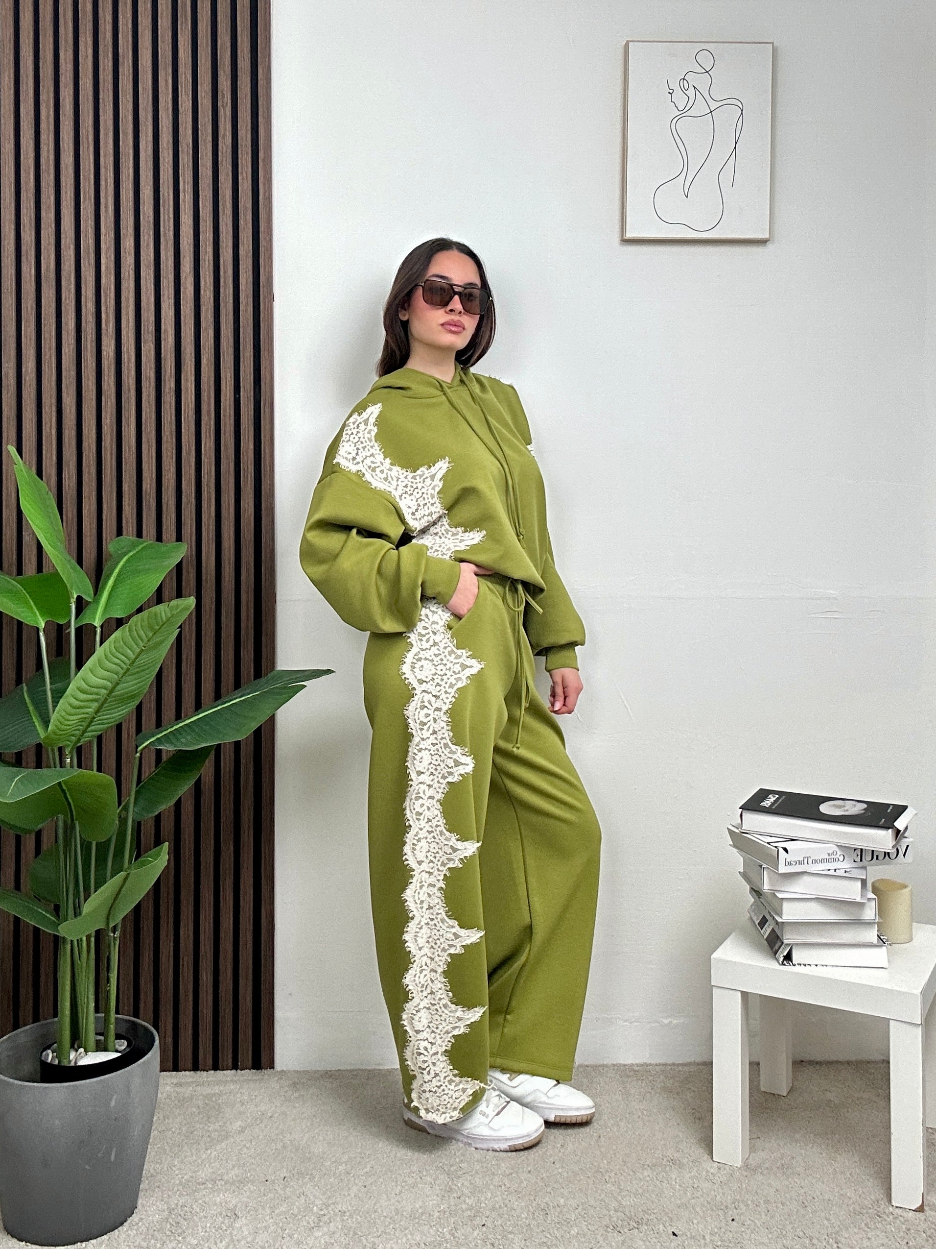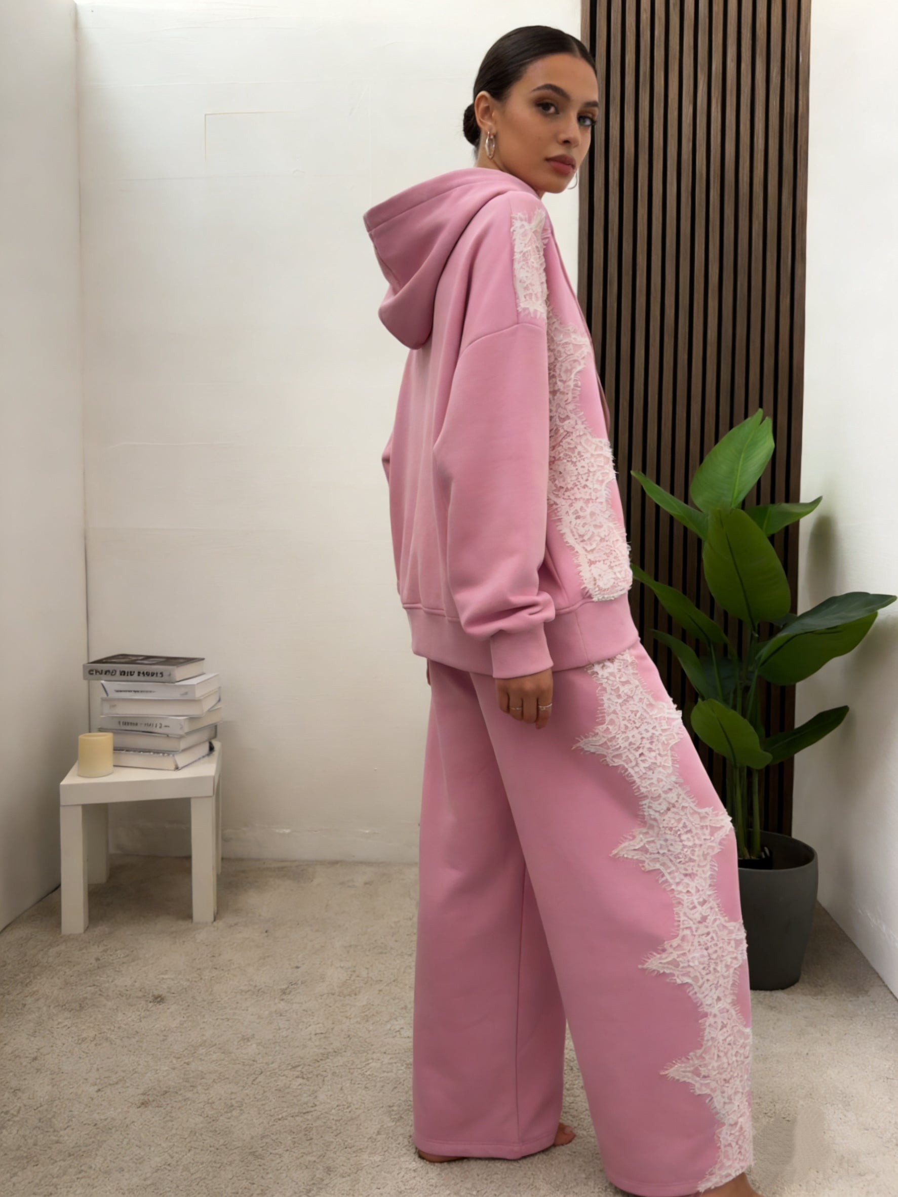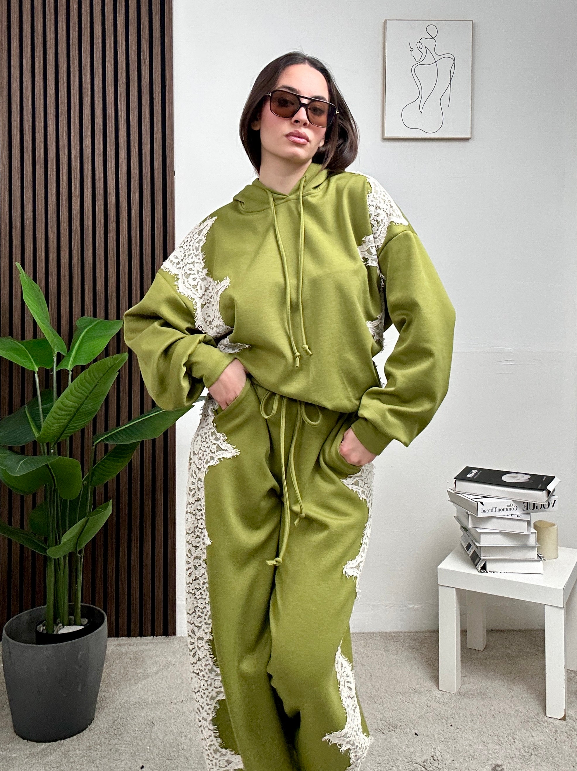 Coordinato LUMINA, presenta felpa oversize a maniche lunghe con cappello dietro e chiusura con zip frontale, pantalone a palazzo con molla in vita, elasticizzato e tasche frontali con ricamo laterale sia del pantalone che della felpa.