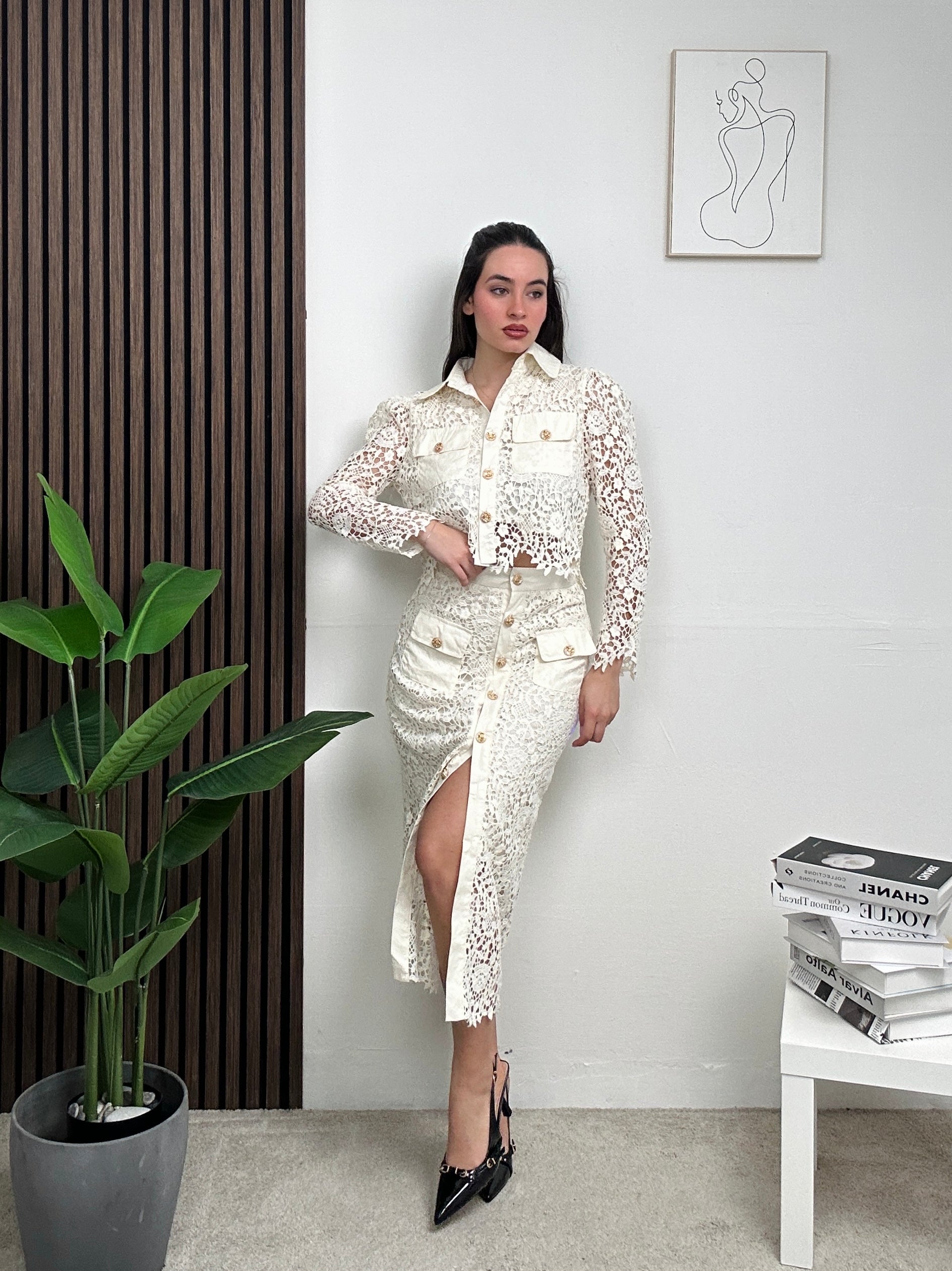 Coordinato BLANCO, presenta gonna lunga elasticizzata con ricamo in pizzo, spacco frontale e con chiusura con bottoni frontali e maglia sopra a maniche lunghe con colletto e chiusura con bottoni frontali.