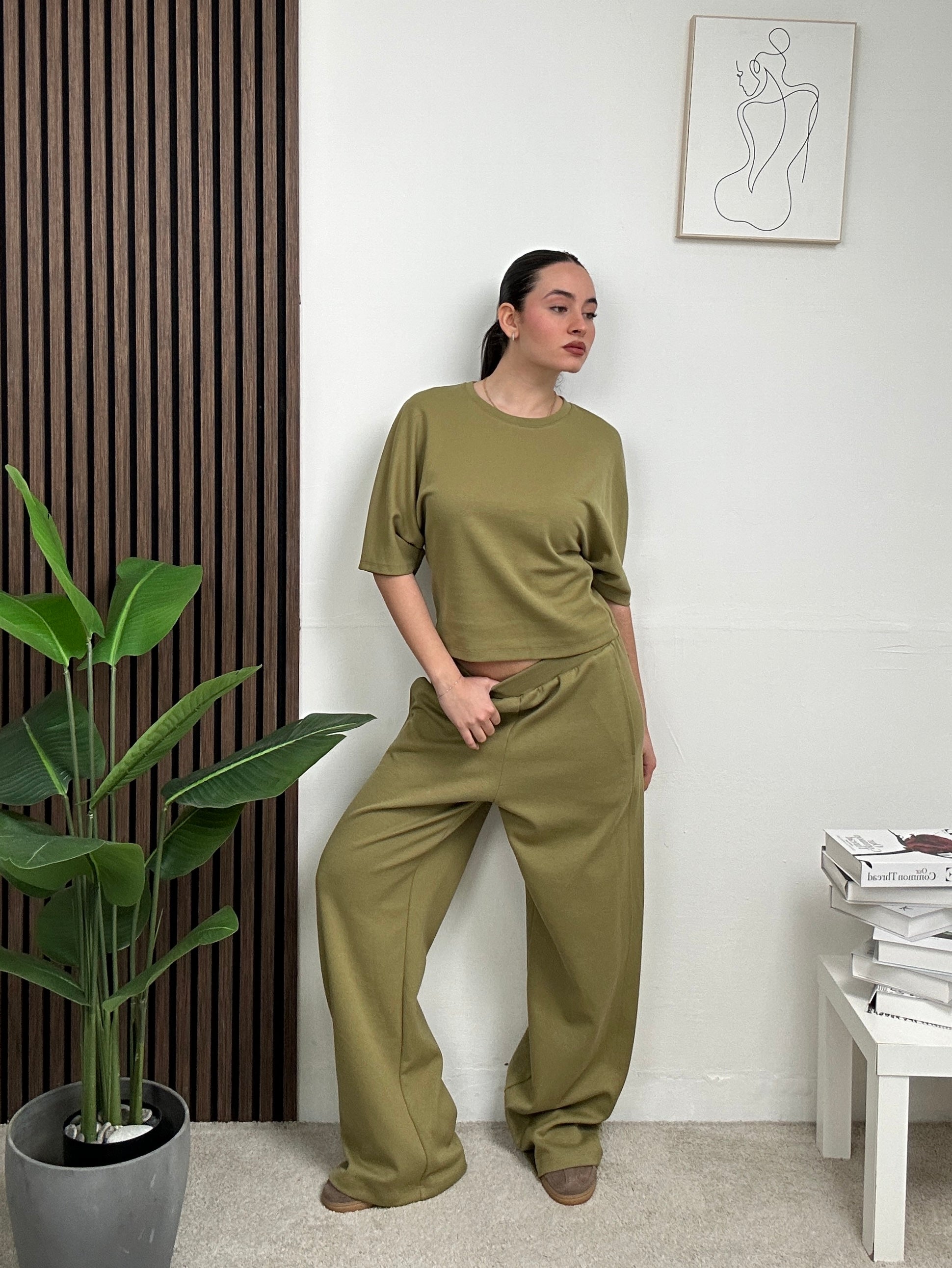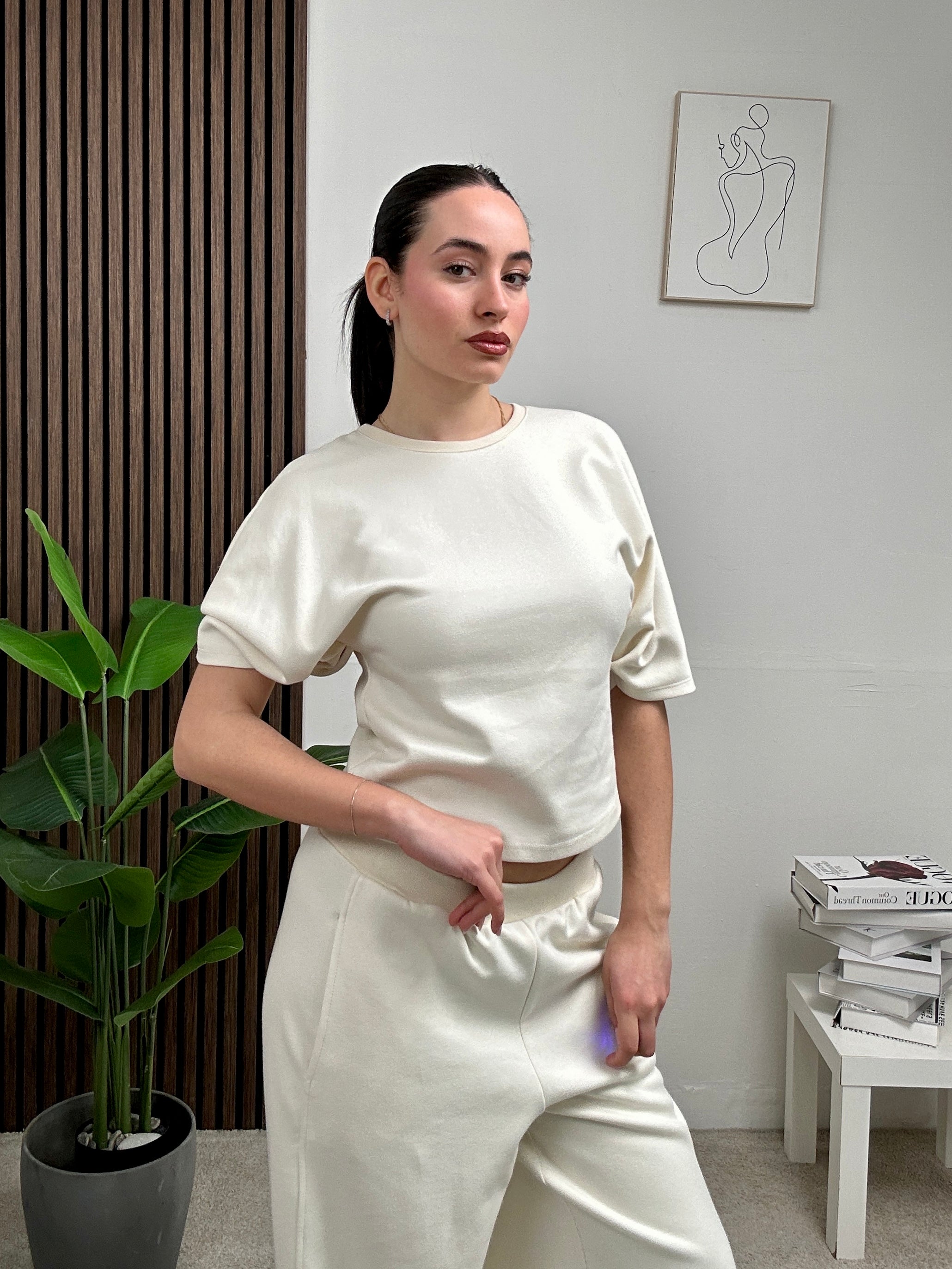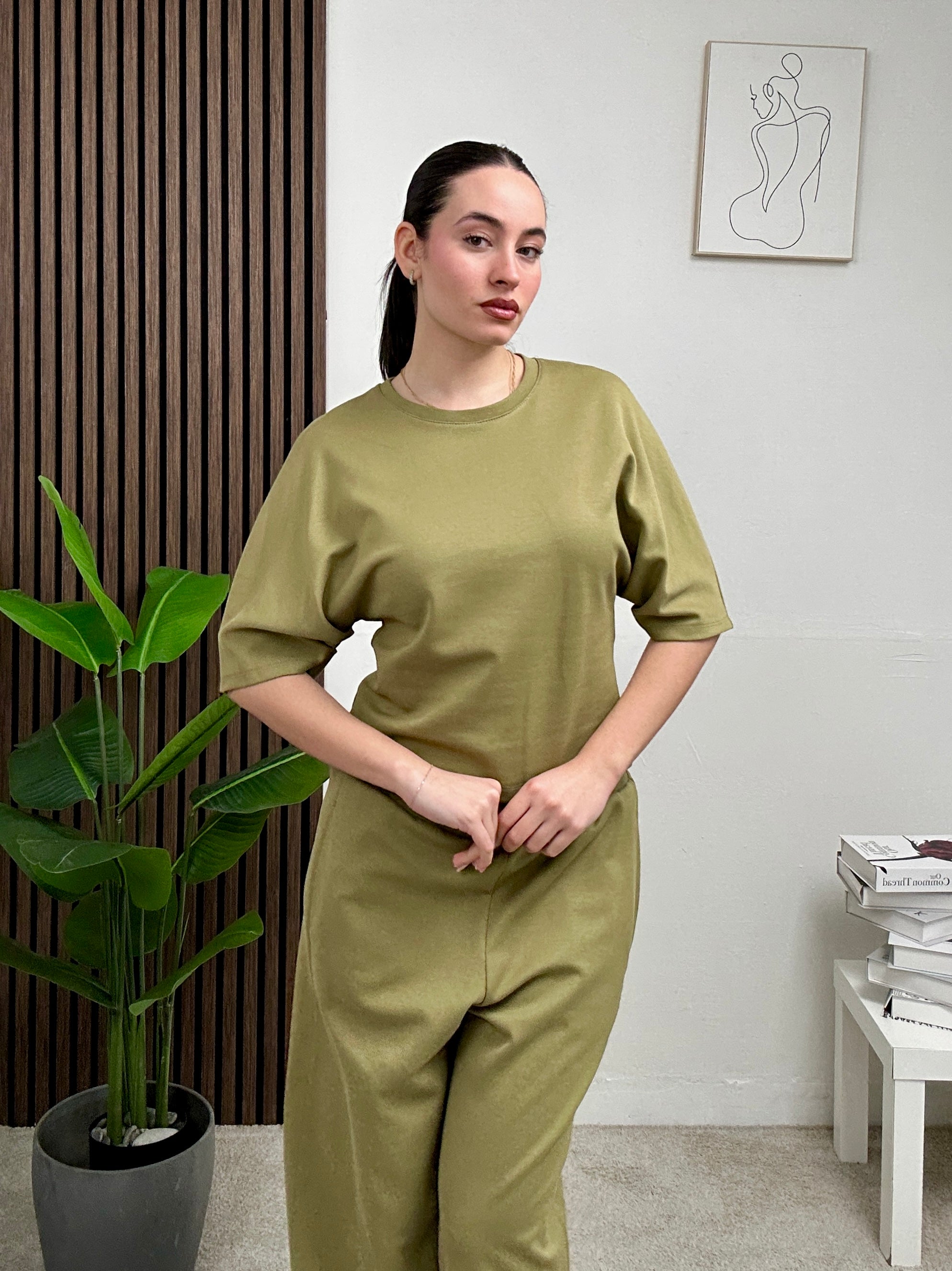 coordinato LARA, si presenta con una magliettina semplice con scollo rotondo e maniche corte , pantalone a palazzo con molla in vita.