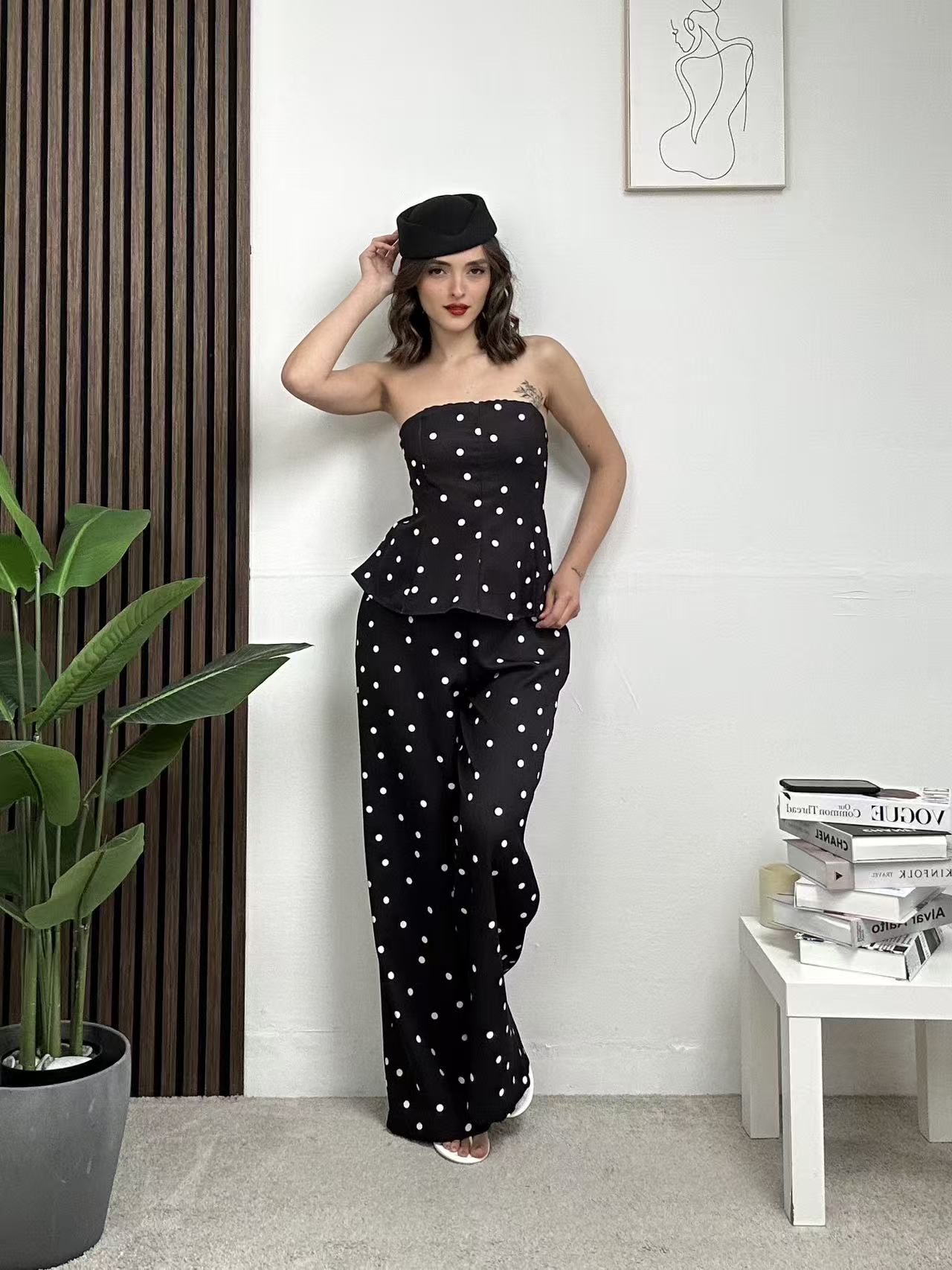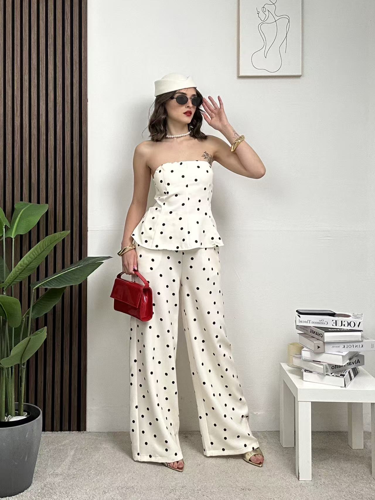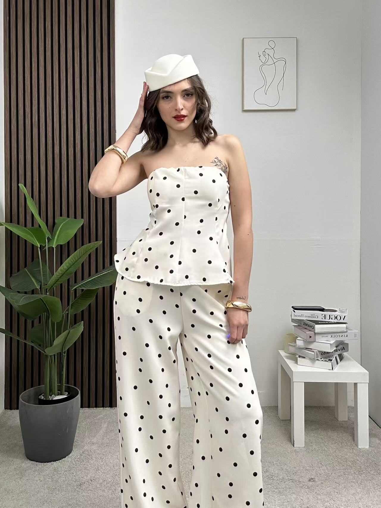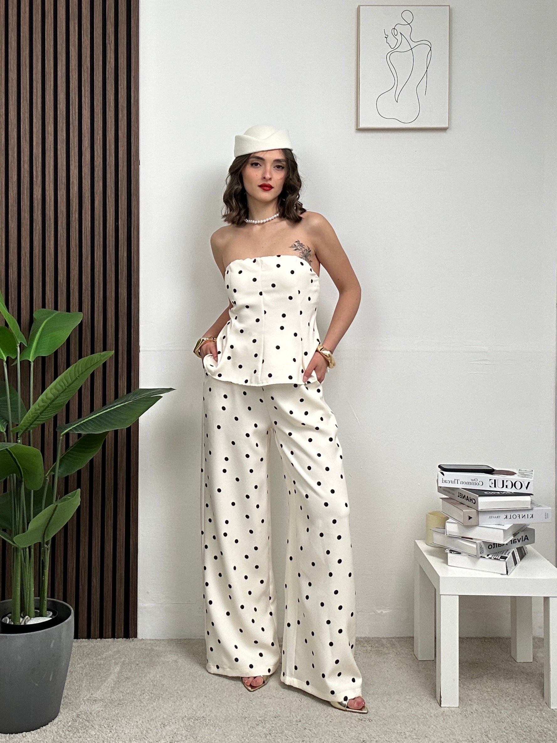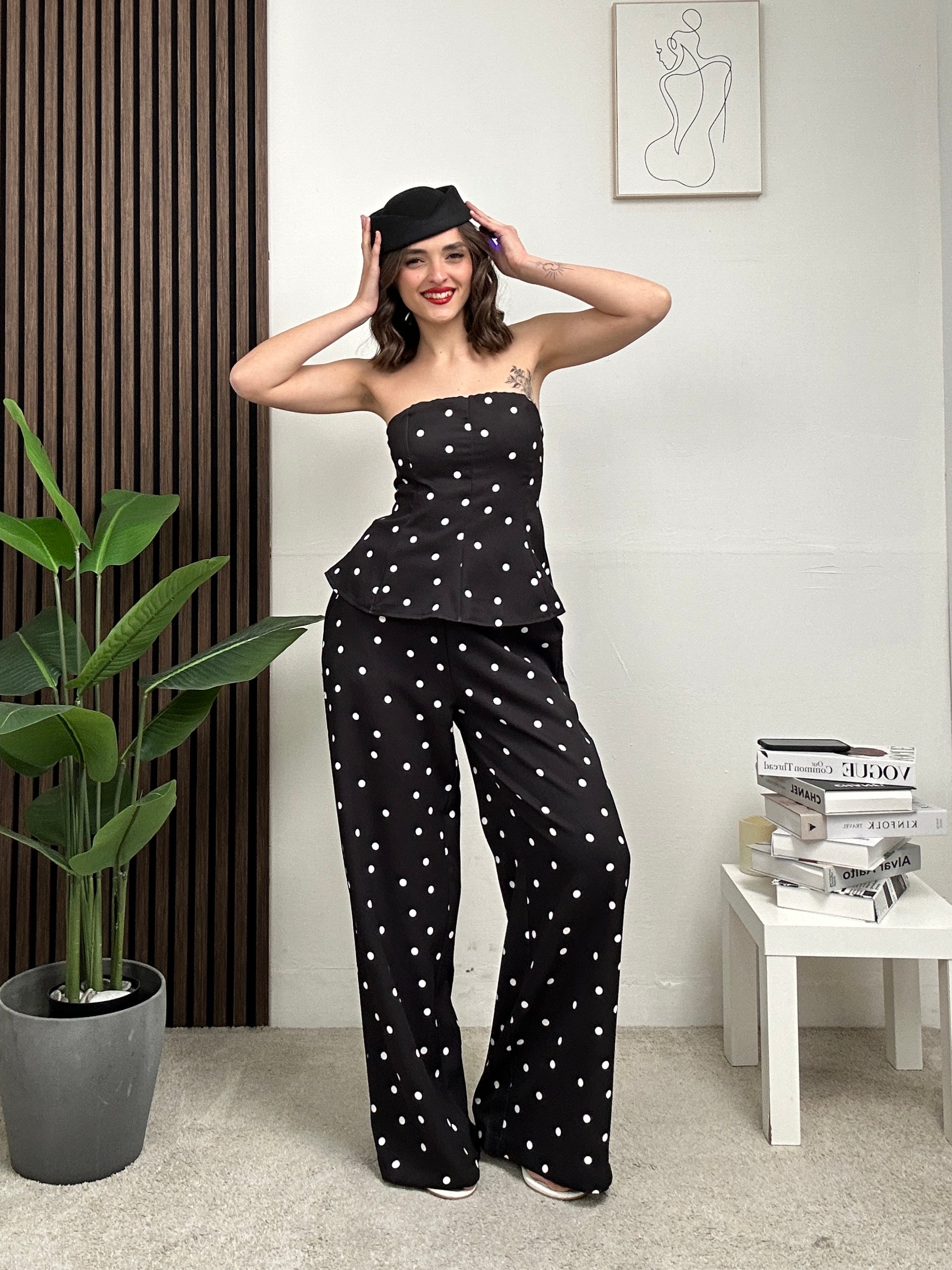 coordinato Marisa è composto da pantalone e maglia, entrambi hanno una molla elastica posteriore, la maglia ha lo scollo a fascia, è stretta sul punto vita e scende larga come il pantalone. Il pantalone calza alto in vita è a palazzo ed ha le tasche laterali.