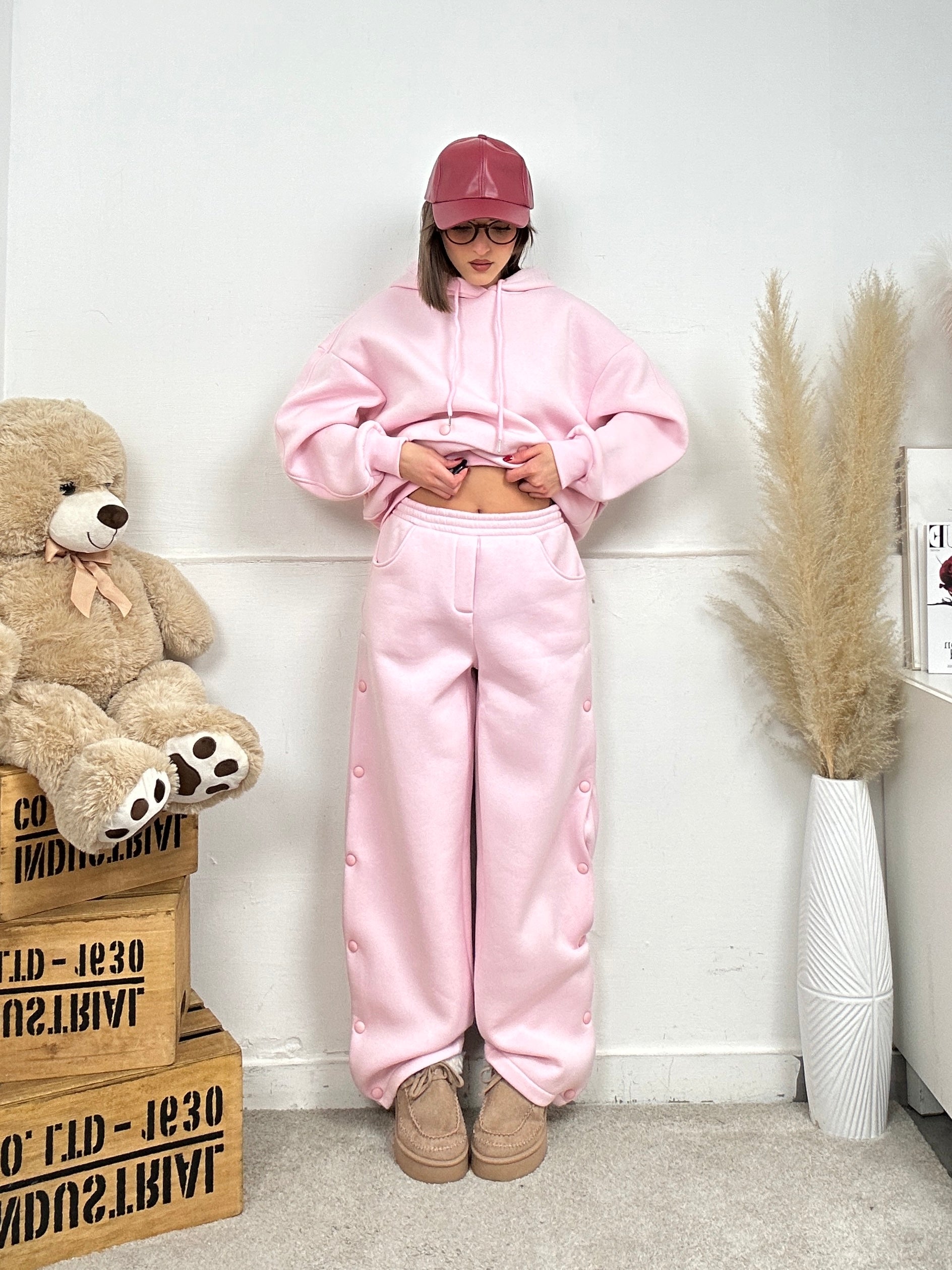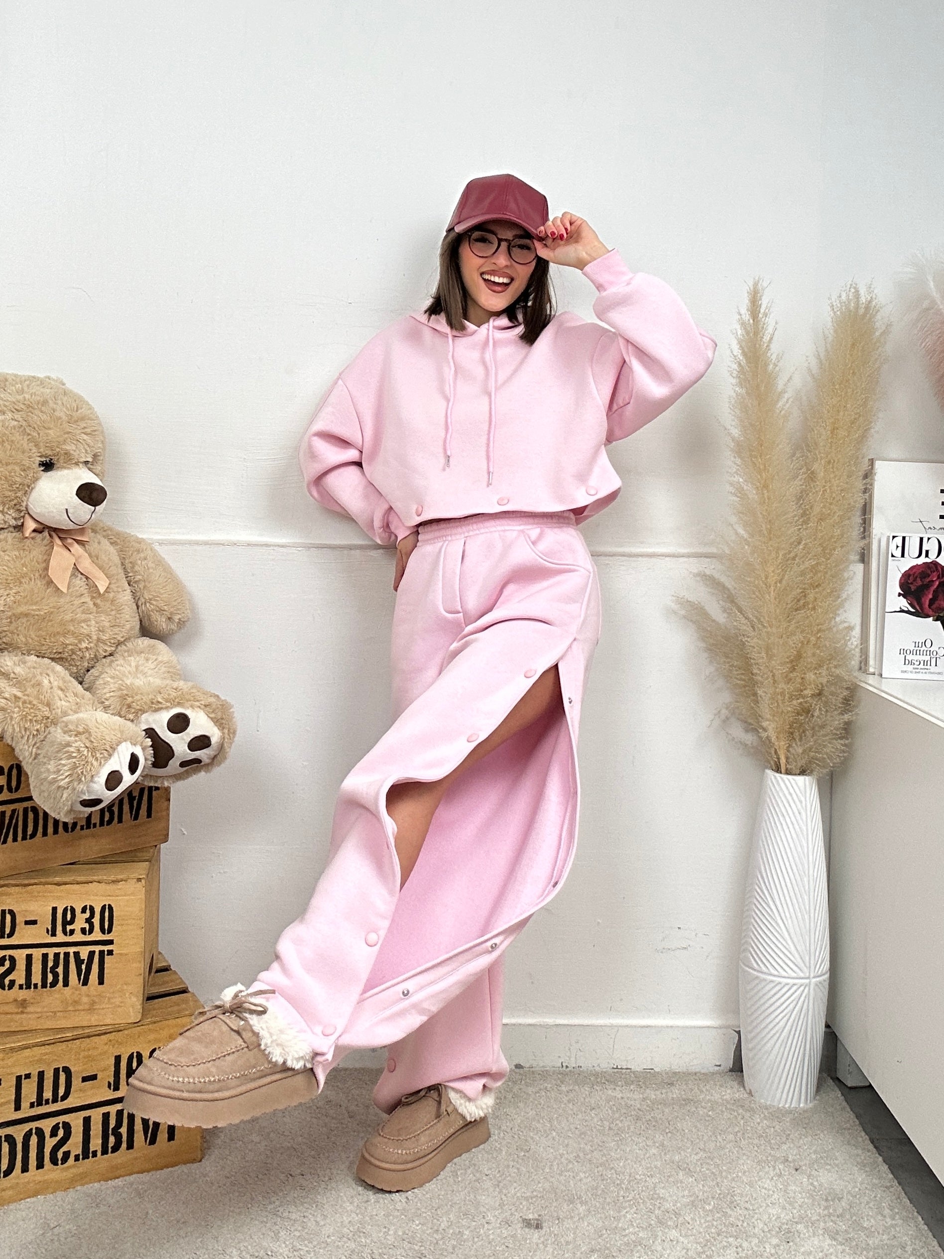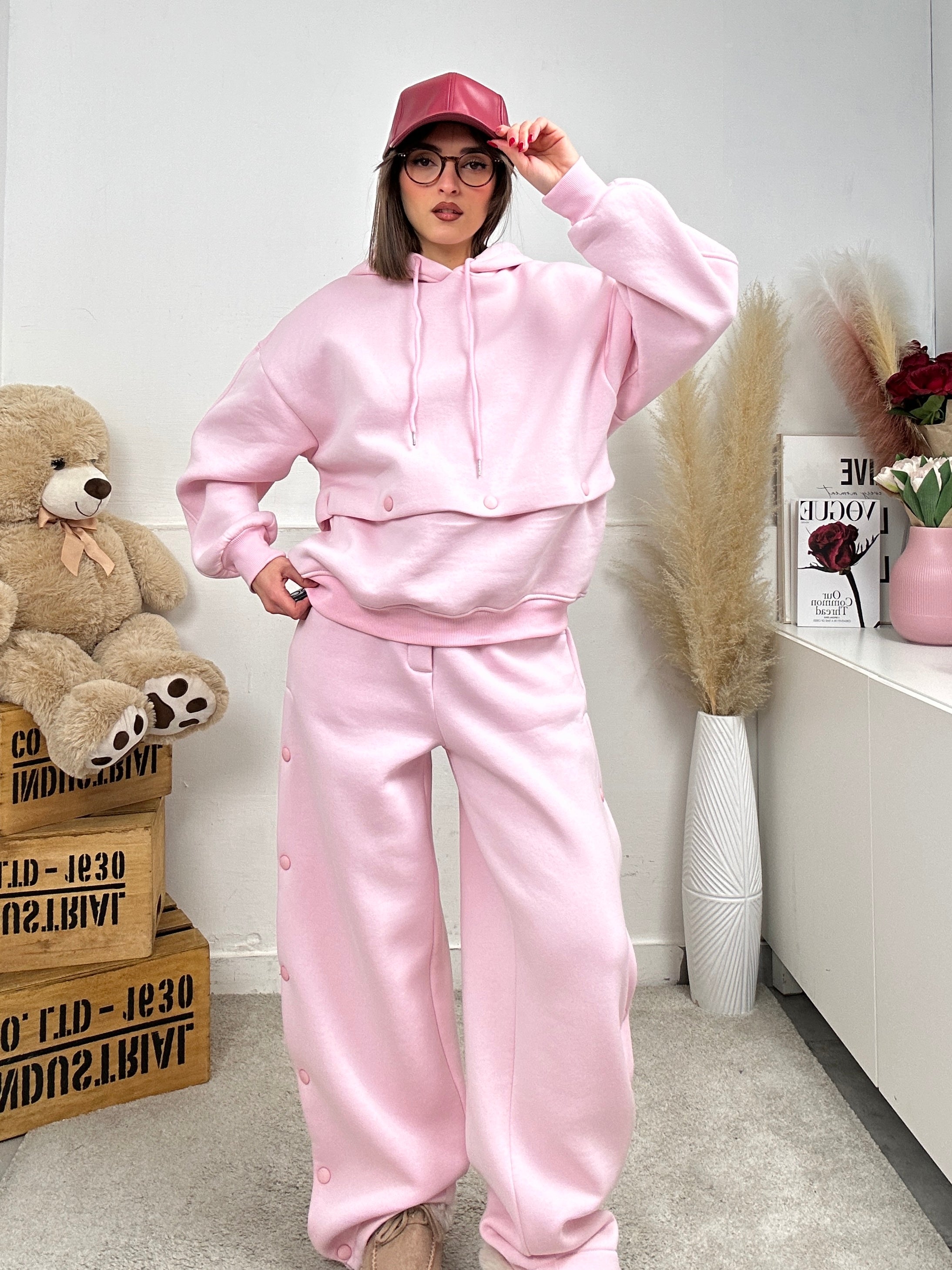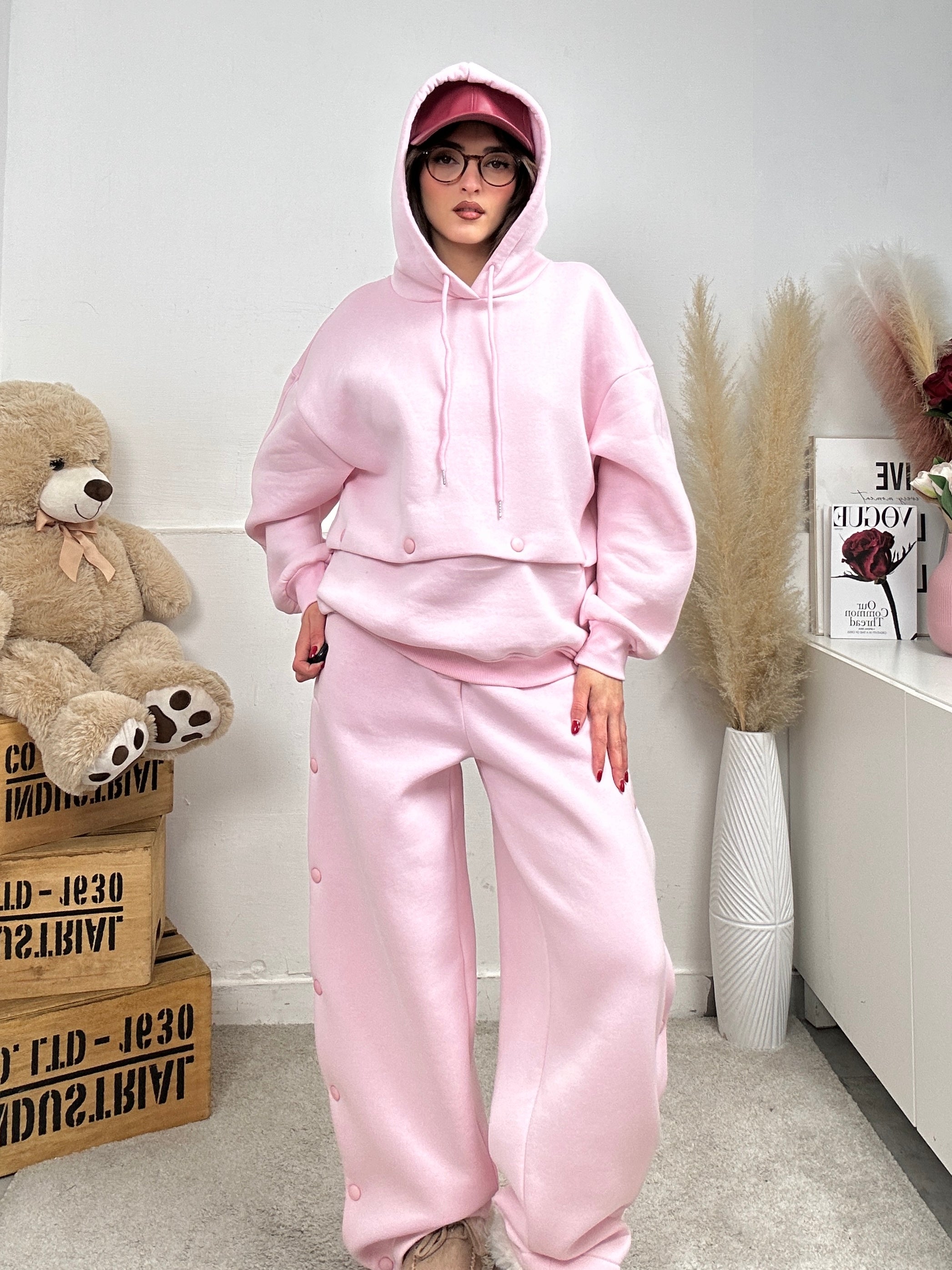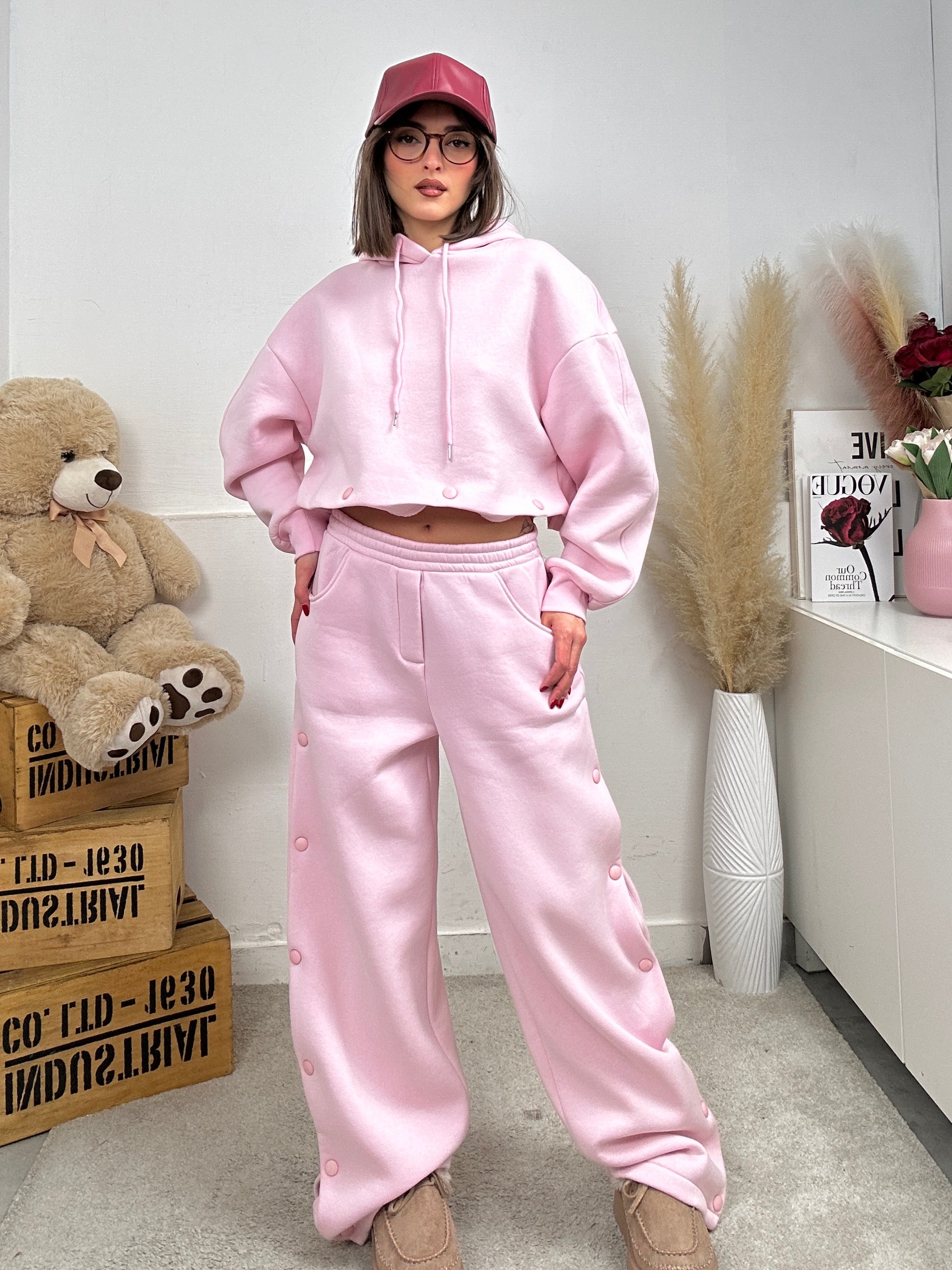Coordinato LUMINA, presenta pantalone di tuta a palazzo, apertura con bottoni lateralmente, molla in vita, elasticizzato e felpa lunga oversize a maniche lunghe con apertura con bottoni sull'orlo finale in modo tale da far diventare la felpa corta.