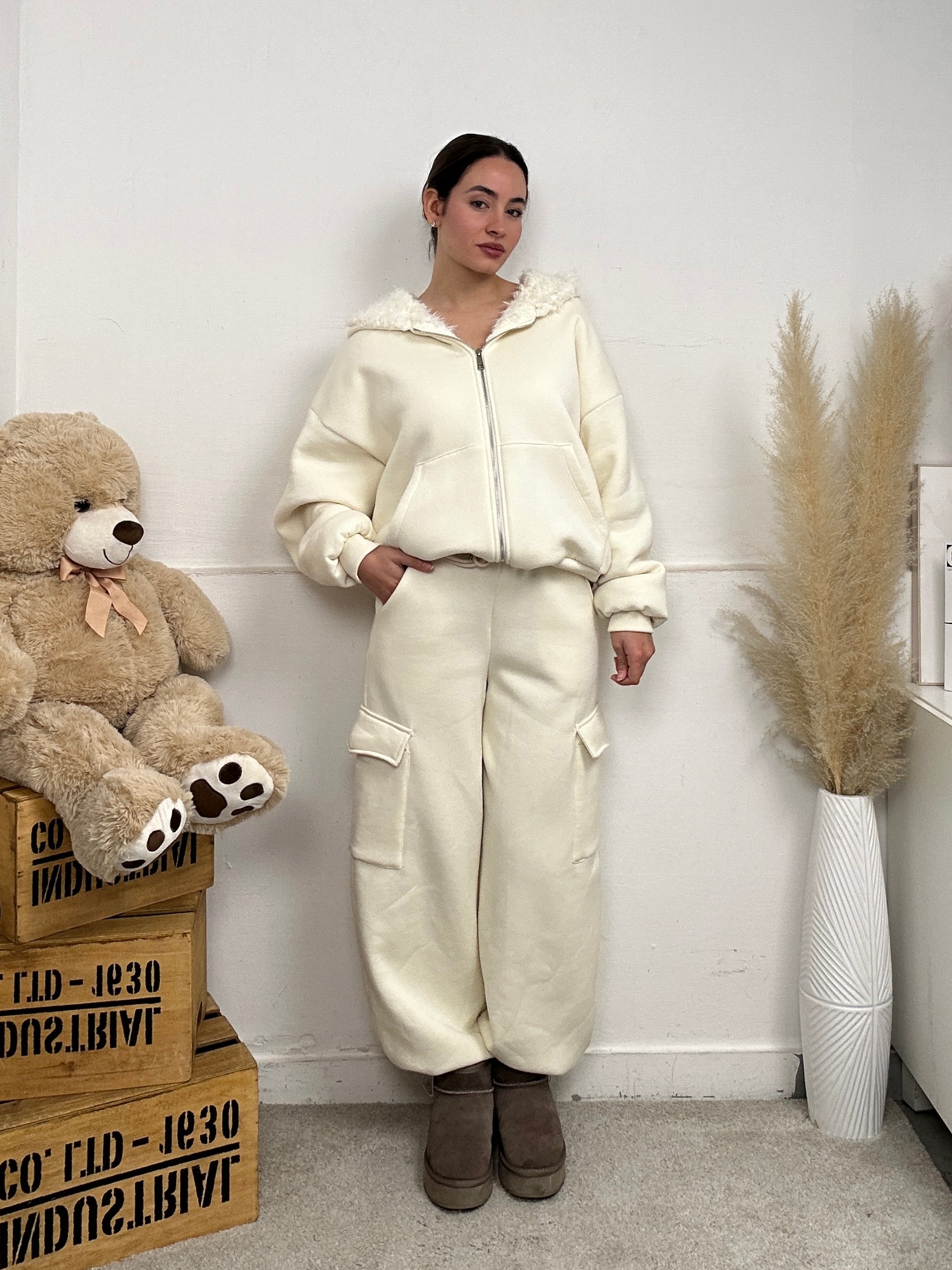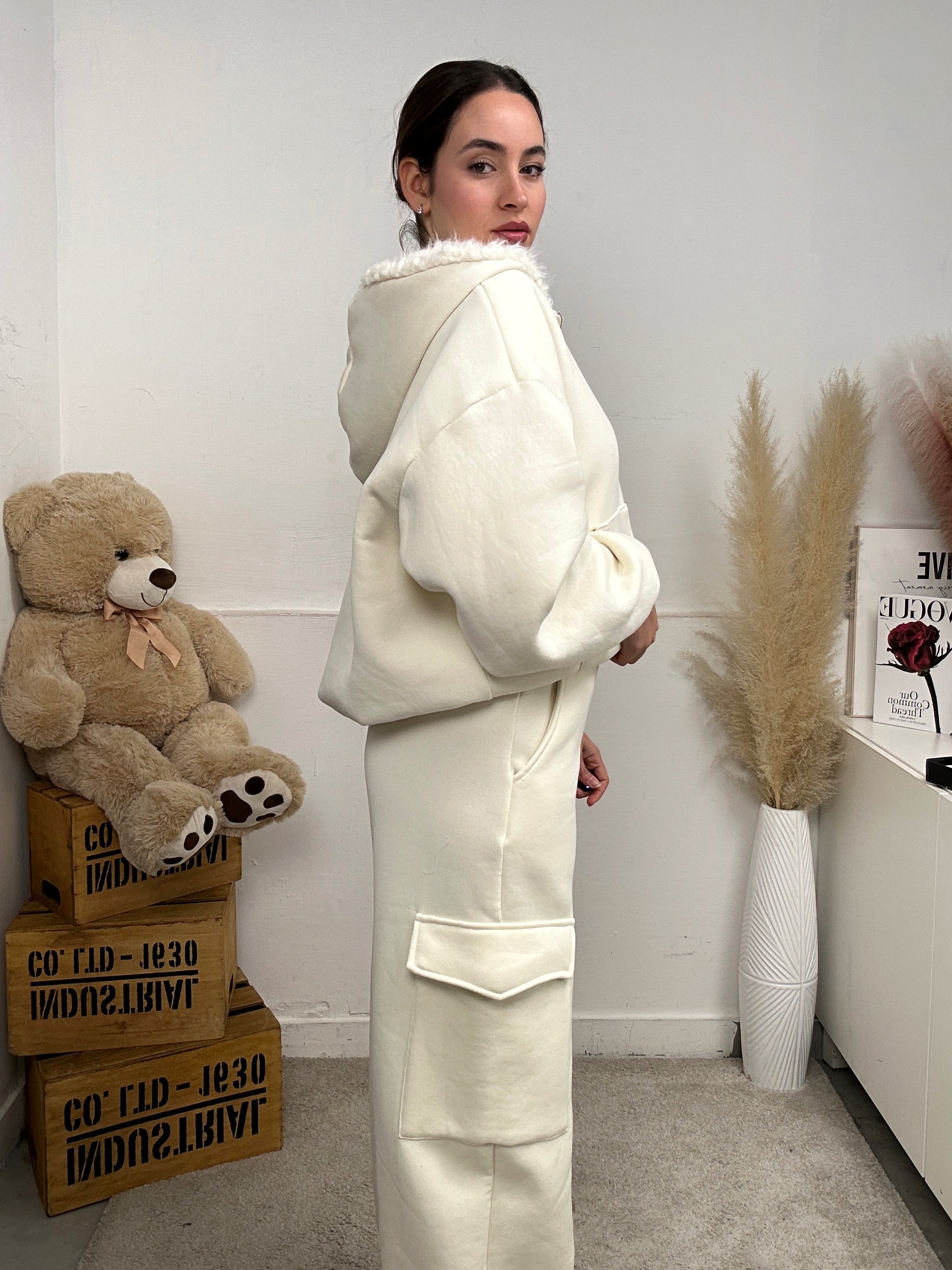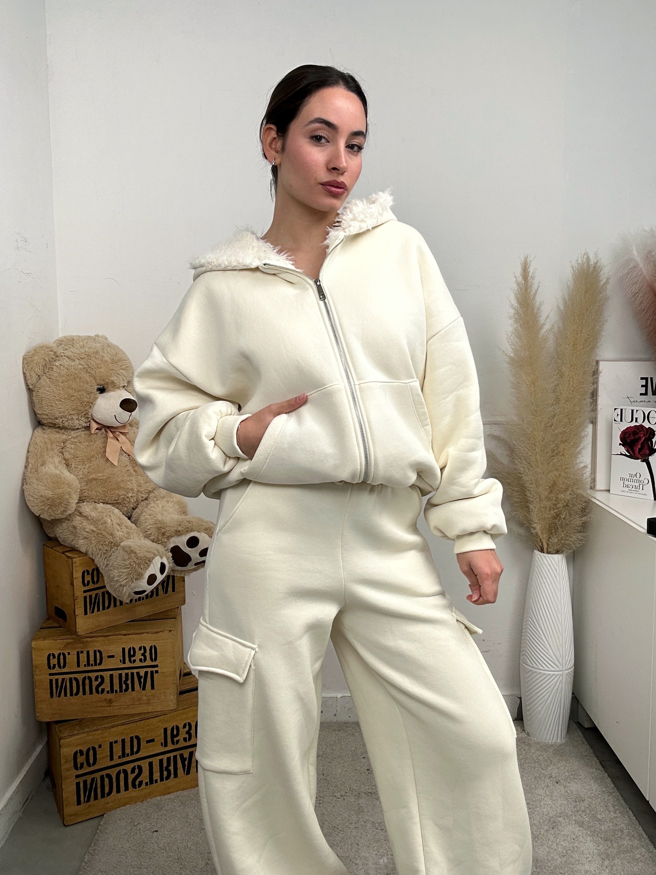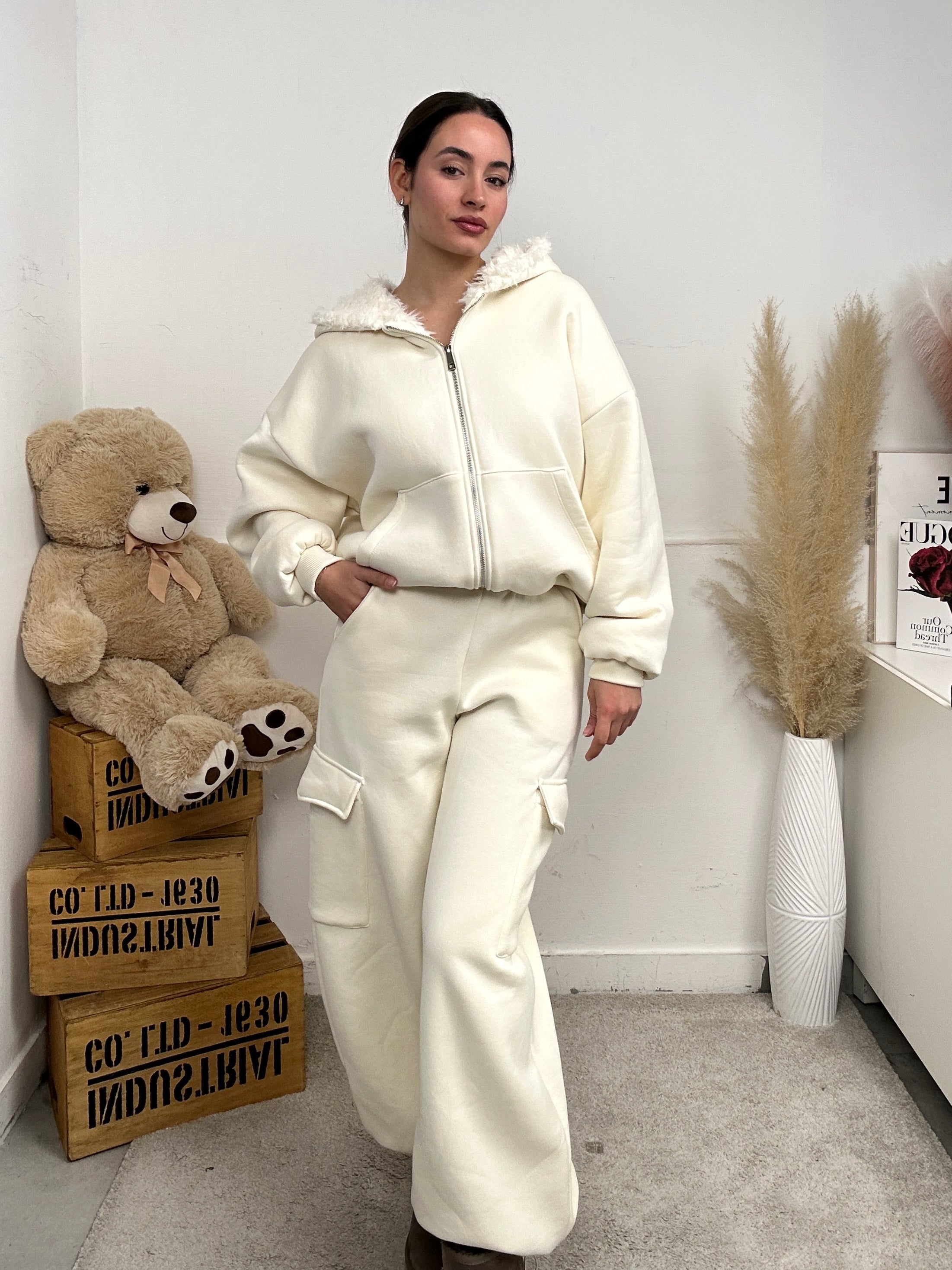Coordinato LUMINA, presenta felpa lunga a maniche lunghe, chiusura con zip, tasche frontali e cappello felpata all'interno, pantalone lungo a palazzo, tasche frontali, elasticizzato e molla in vita.