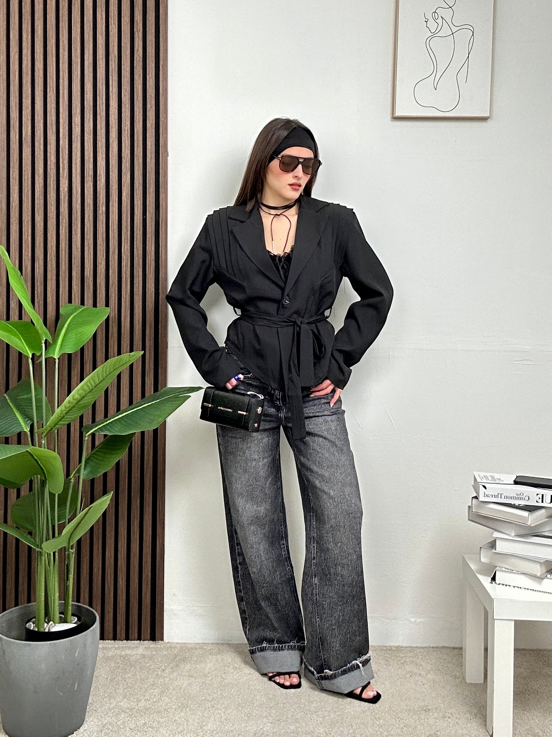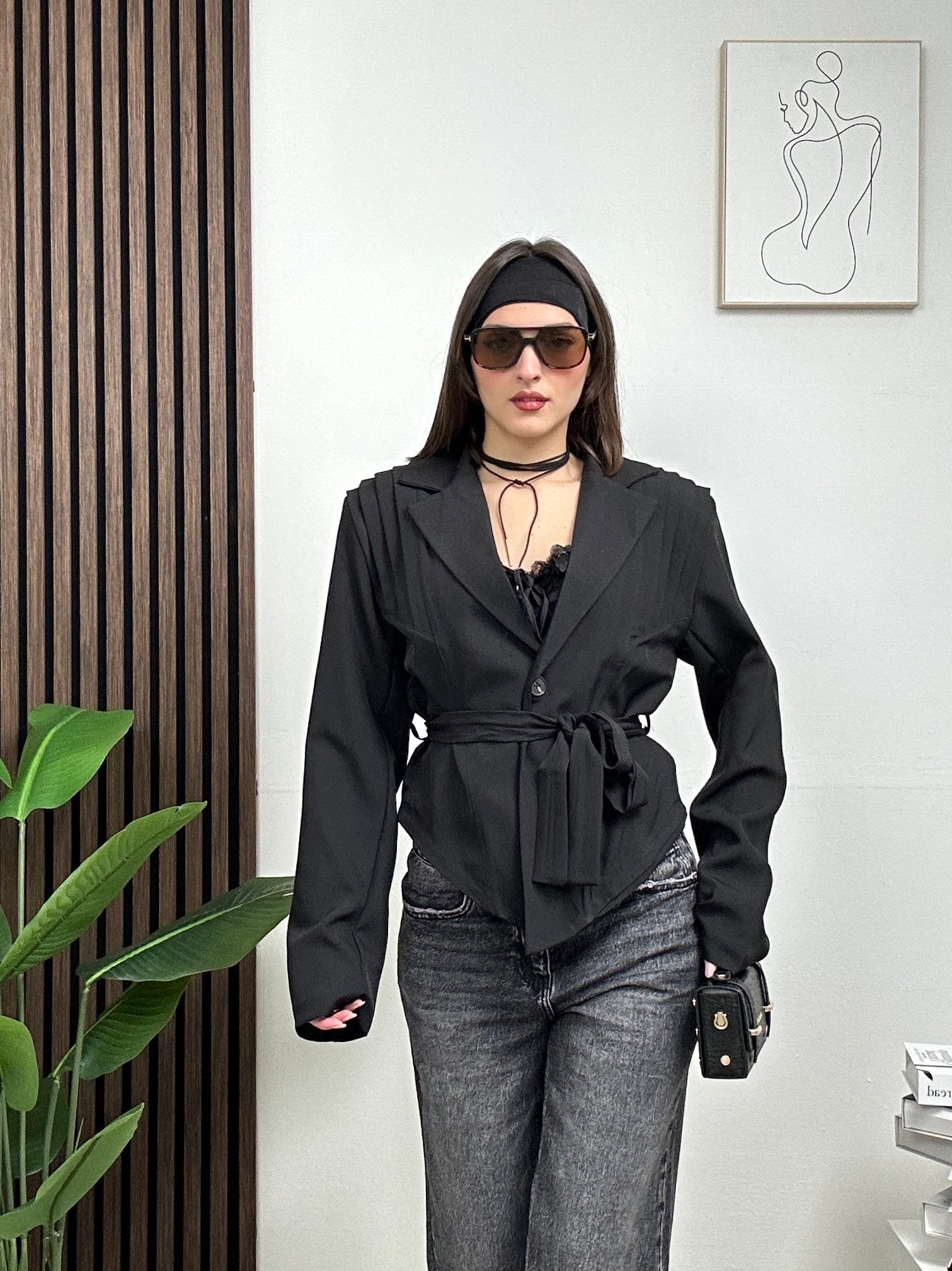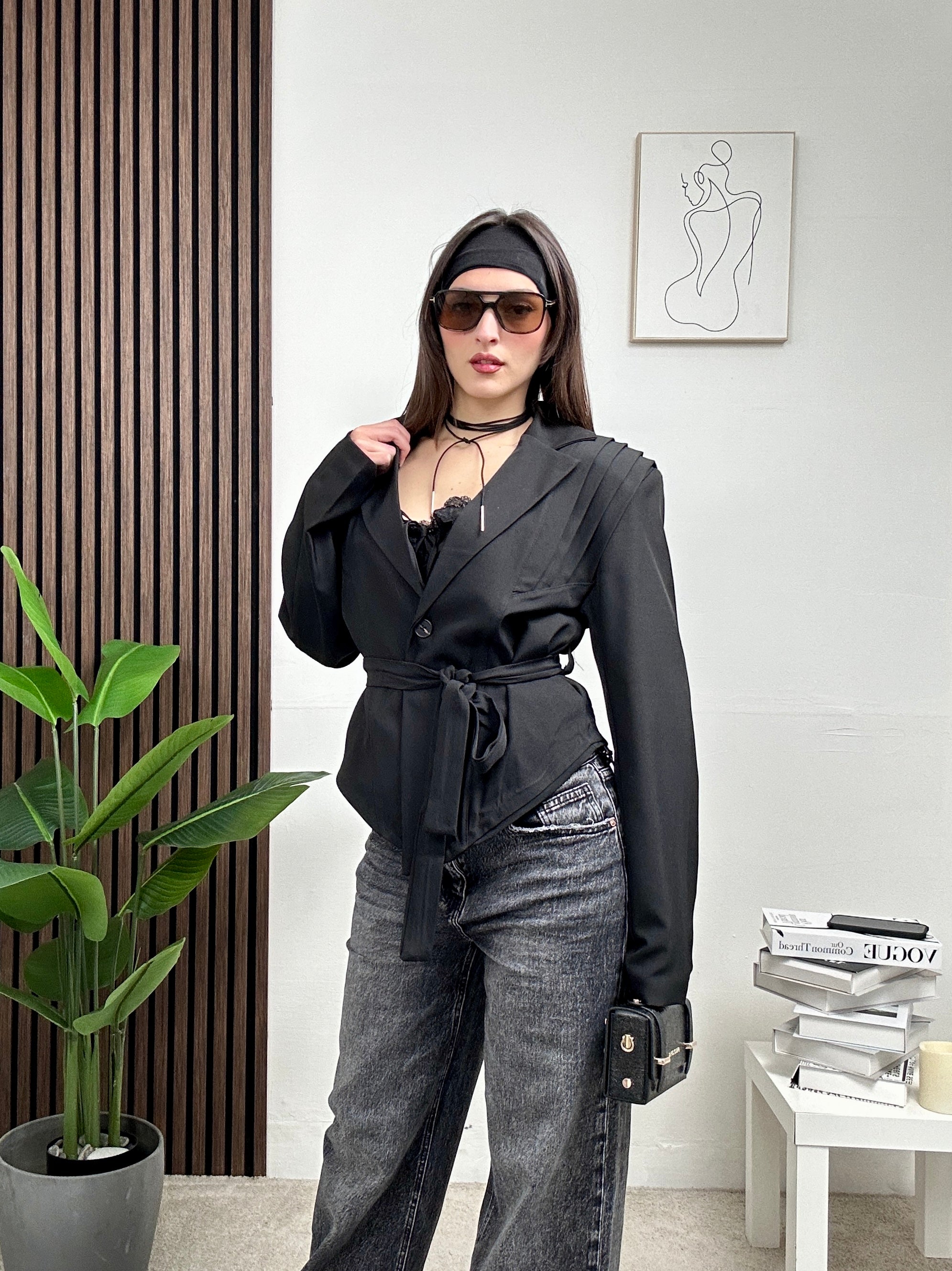Giacca corta, a maniche lunghe con scollo a V e colletto, fodera all’interno e chiusura con bottone e cintura in vita.