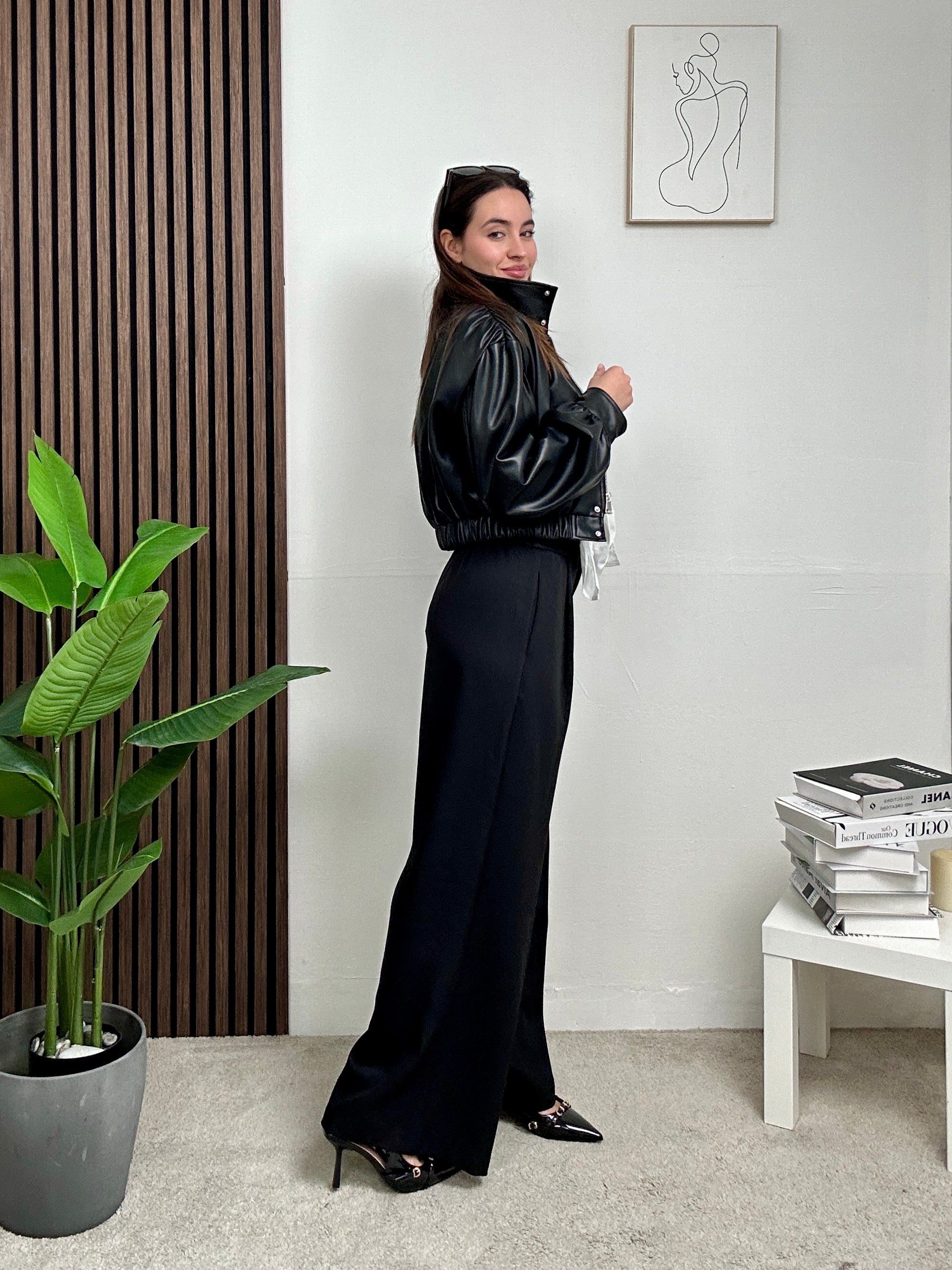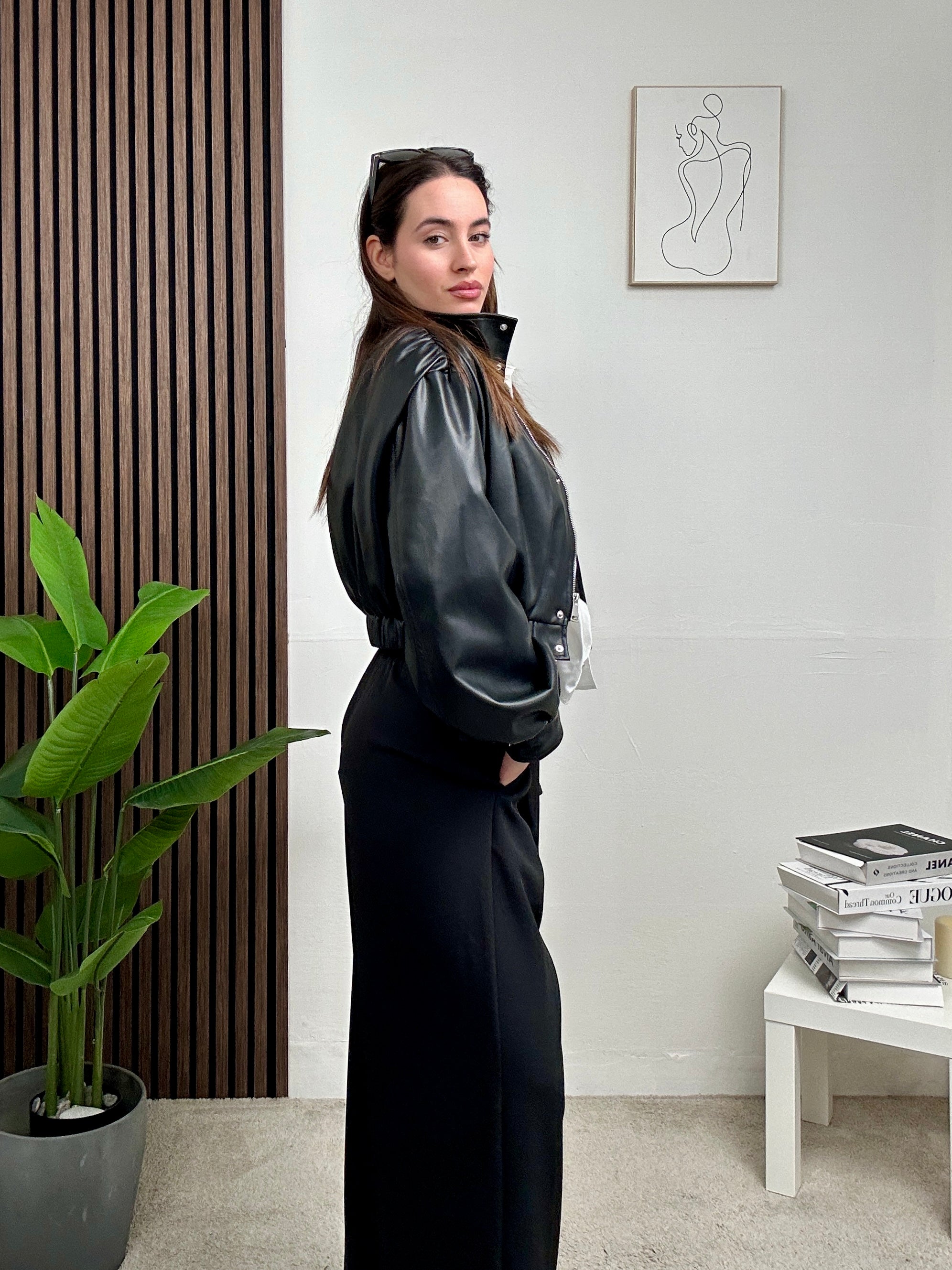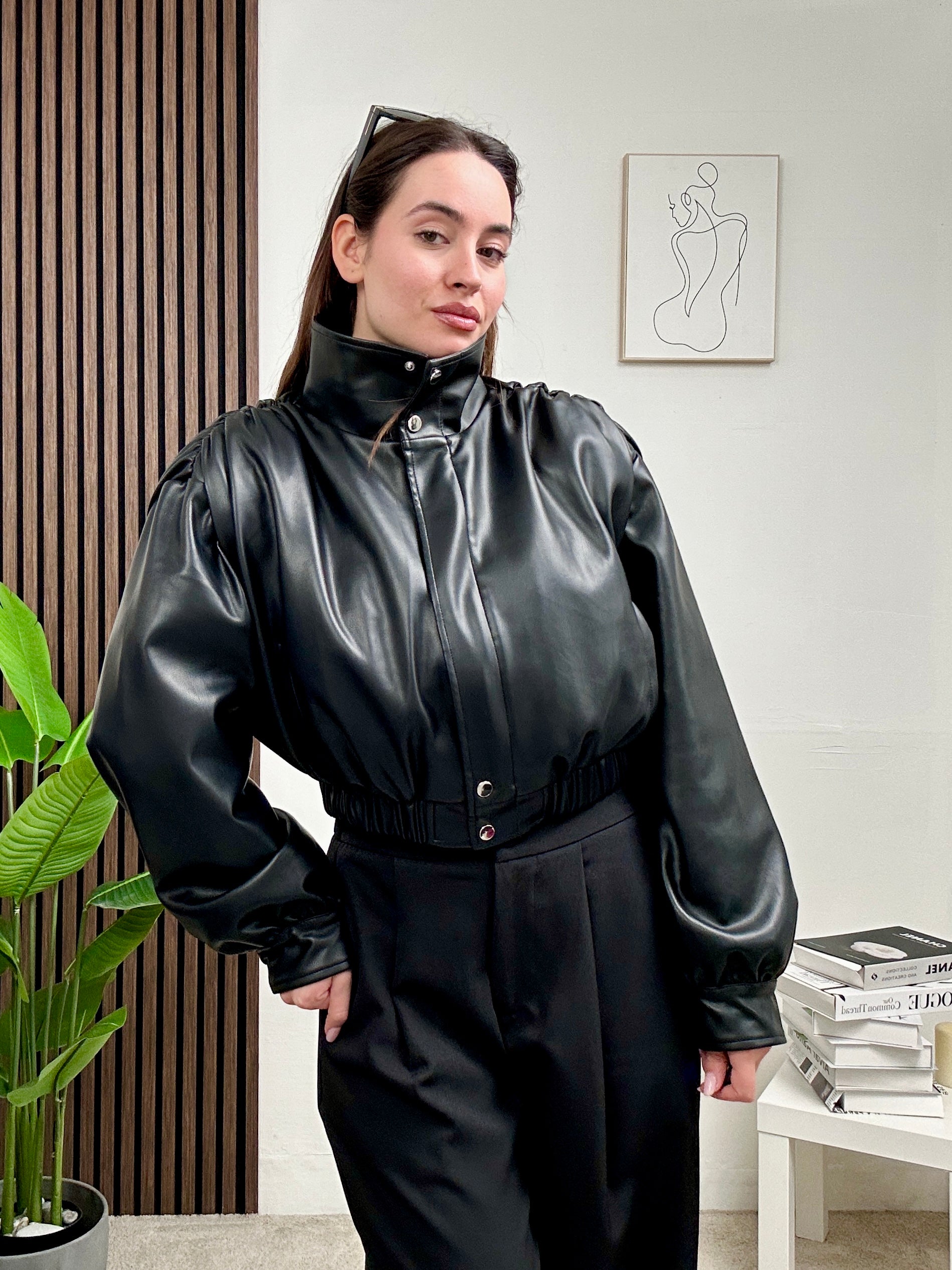Giacca in eco-pelle dal design contemporaneo con collo alto e chiusura frontale a bottoni. Il punto vita elasticizzato valorizza la silhouette, mentre le maniche leggermente voluminose aggiungono carattere e struttura al look. Perfetta da abbinare a pantaloni sartoriali o denim per outfit grintosi e sofisticati, dal giorno alla sera. Un capo must-have dal fascino deciso e versatile.
