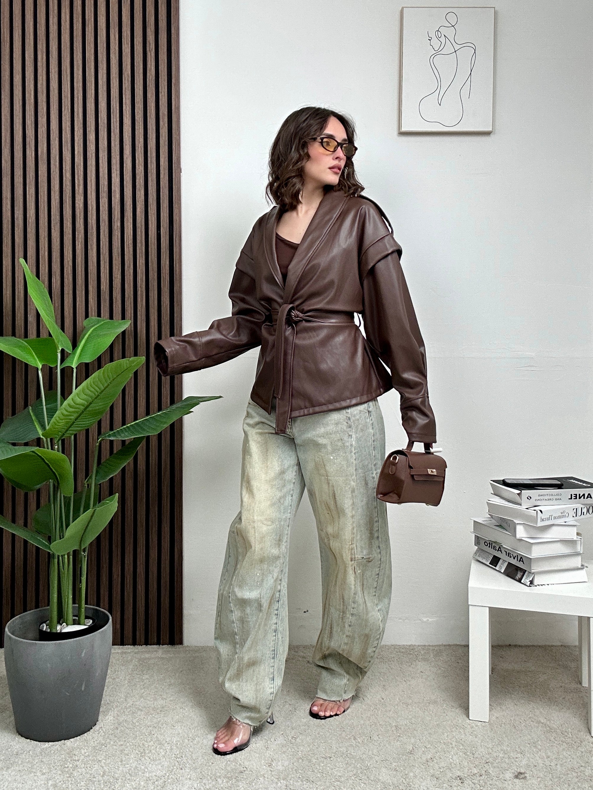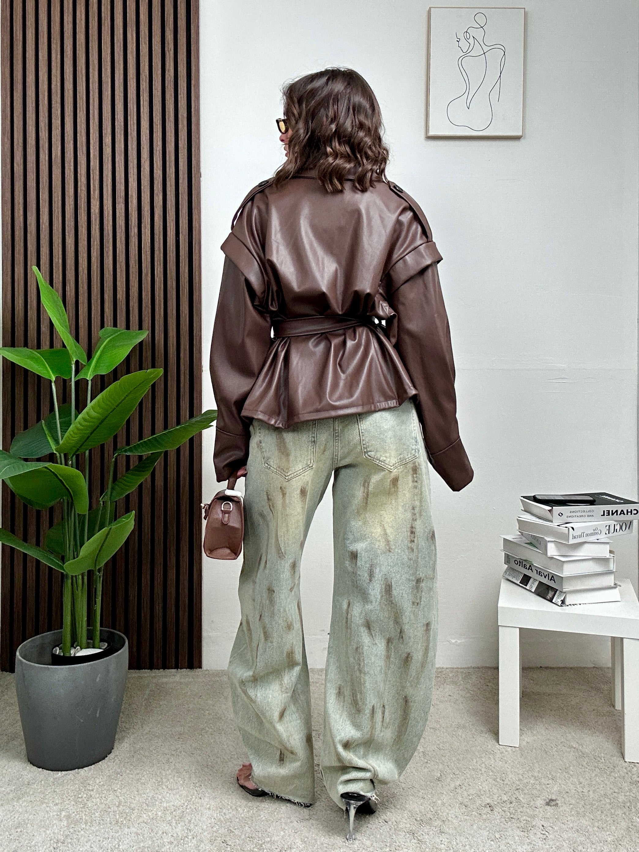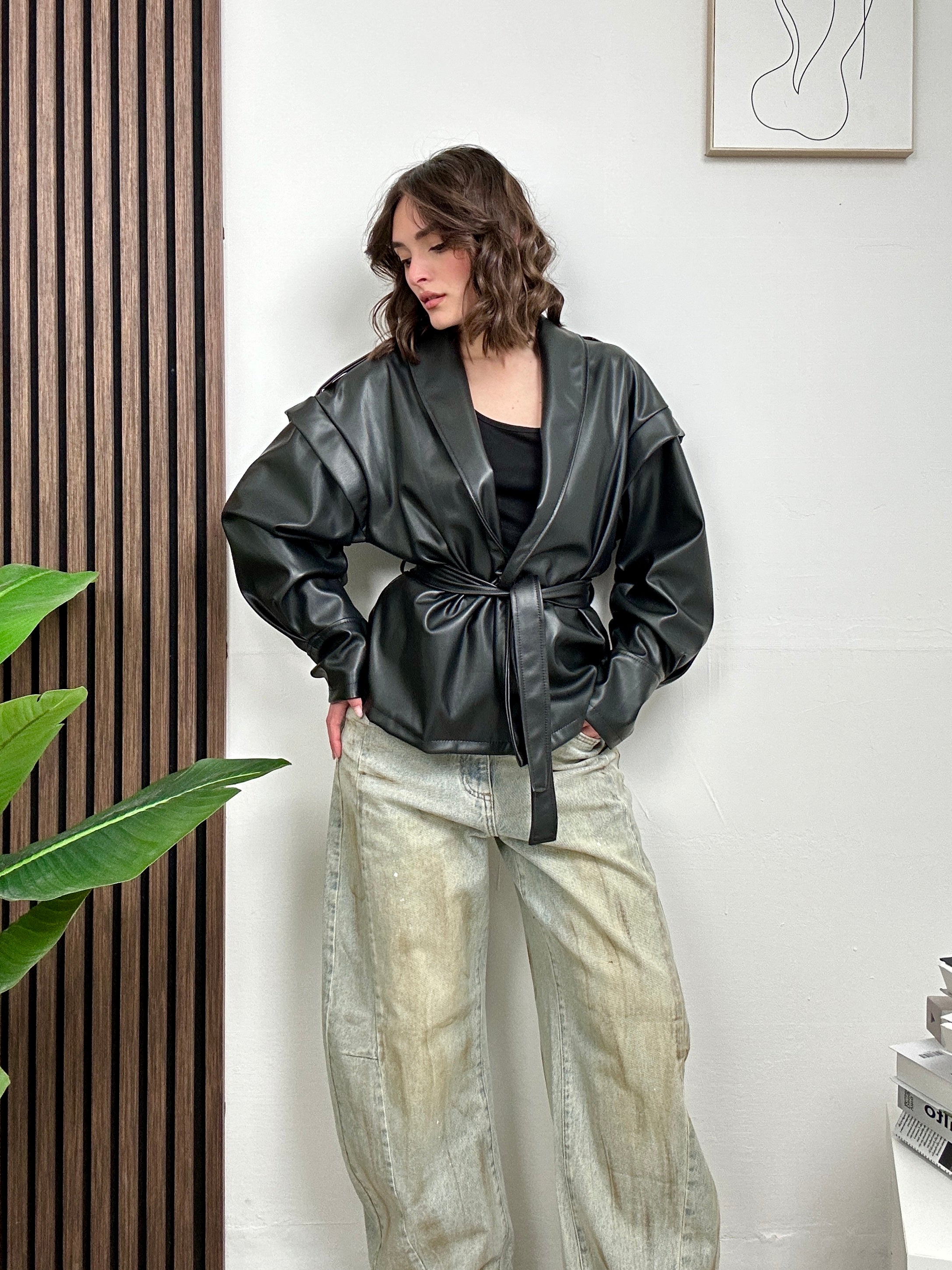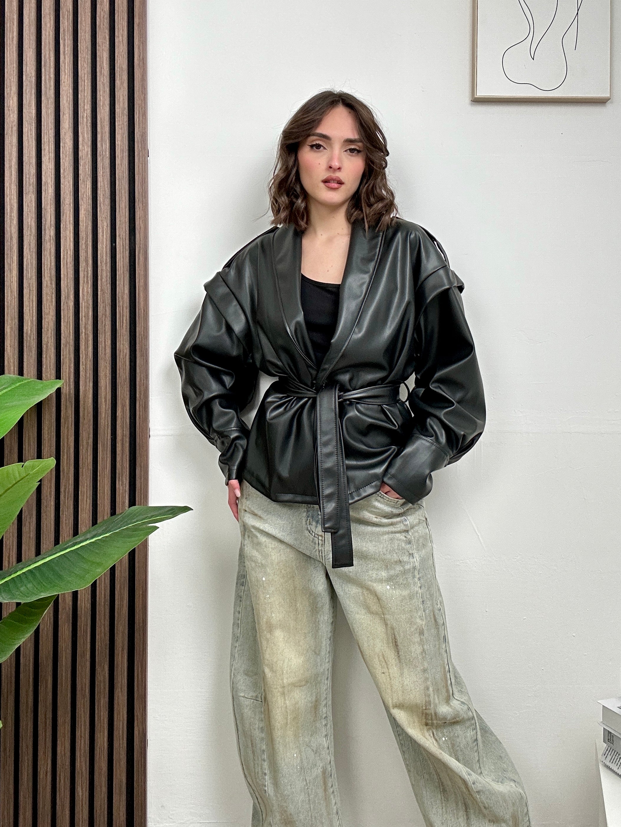 Giubbotto in ecopelle, lungo con scollo a V e colletto, maniche lunghe, fodera all’interno, spalline imbottite e chiusura con bottoni frontali e cintura in vita.