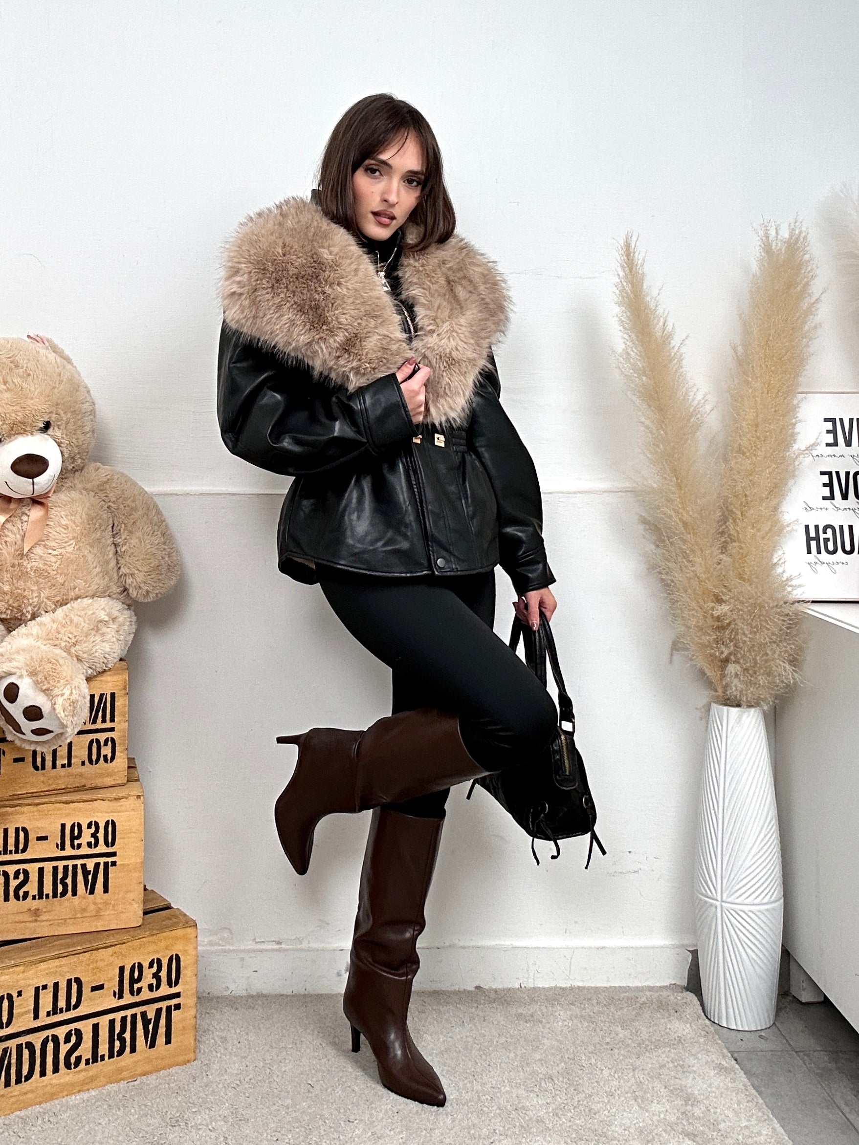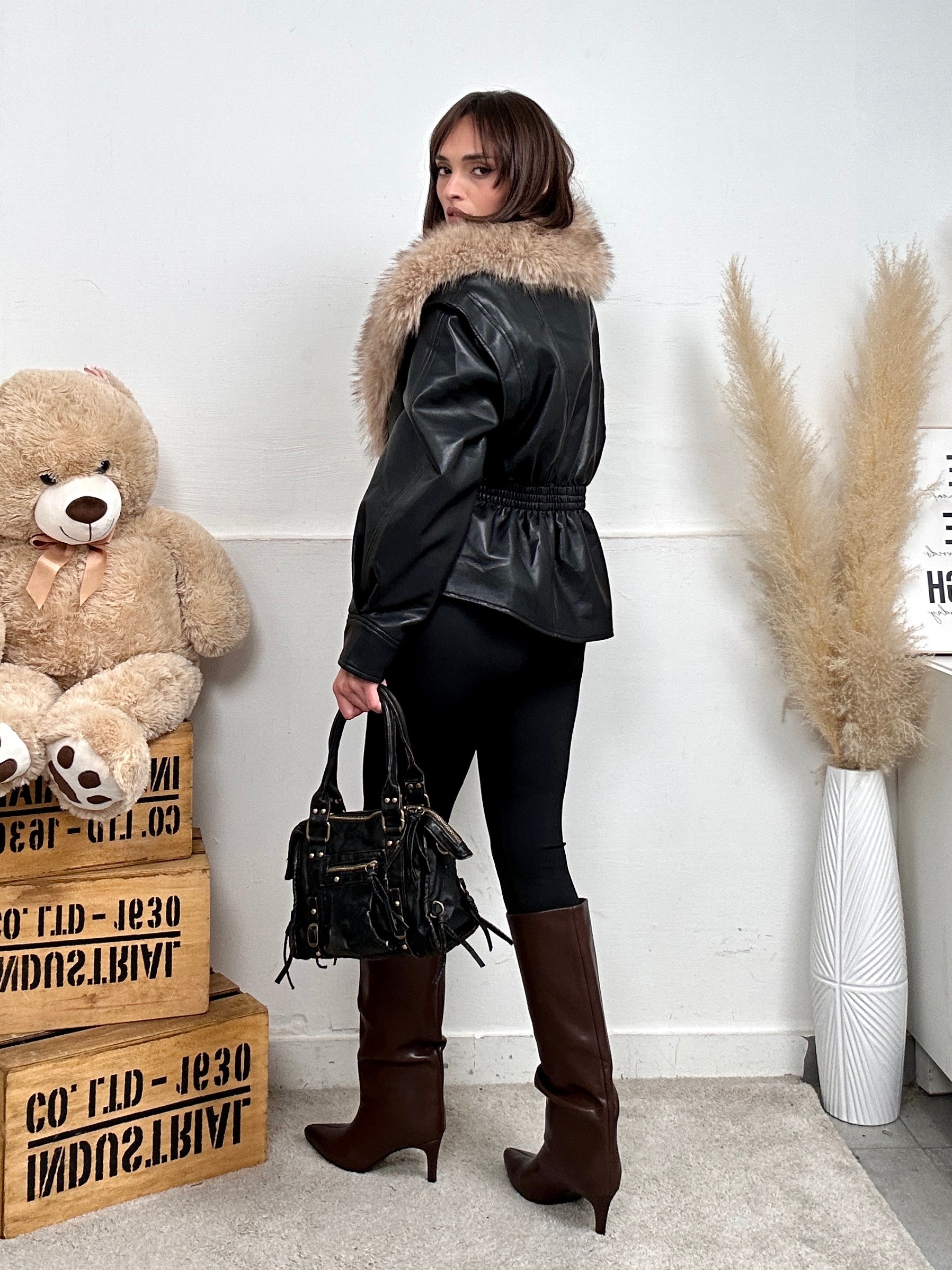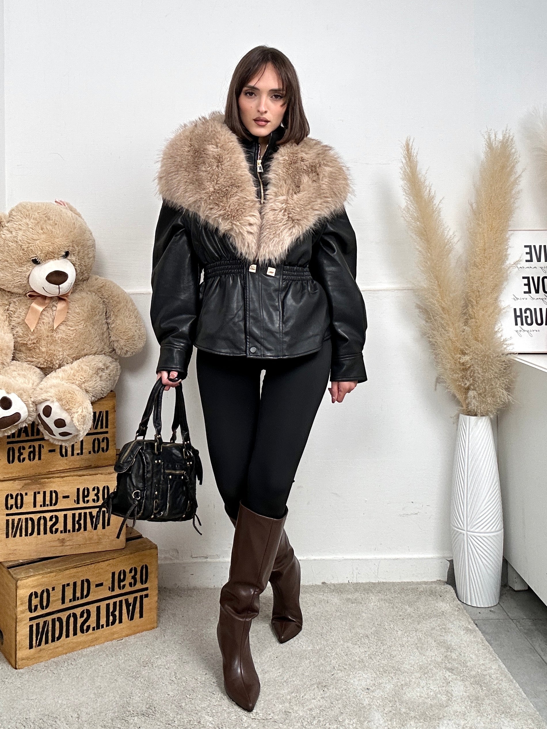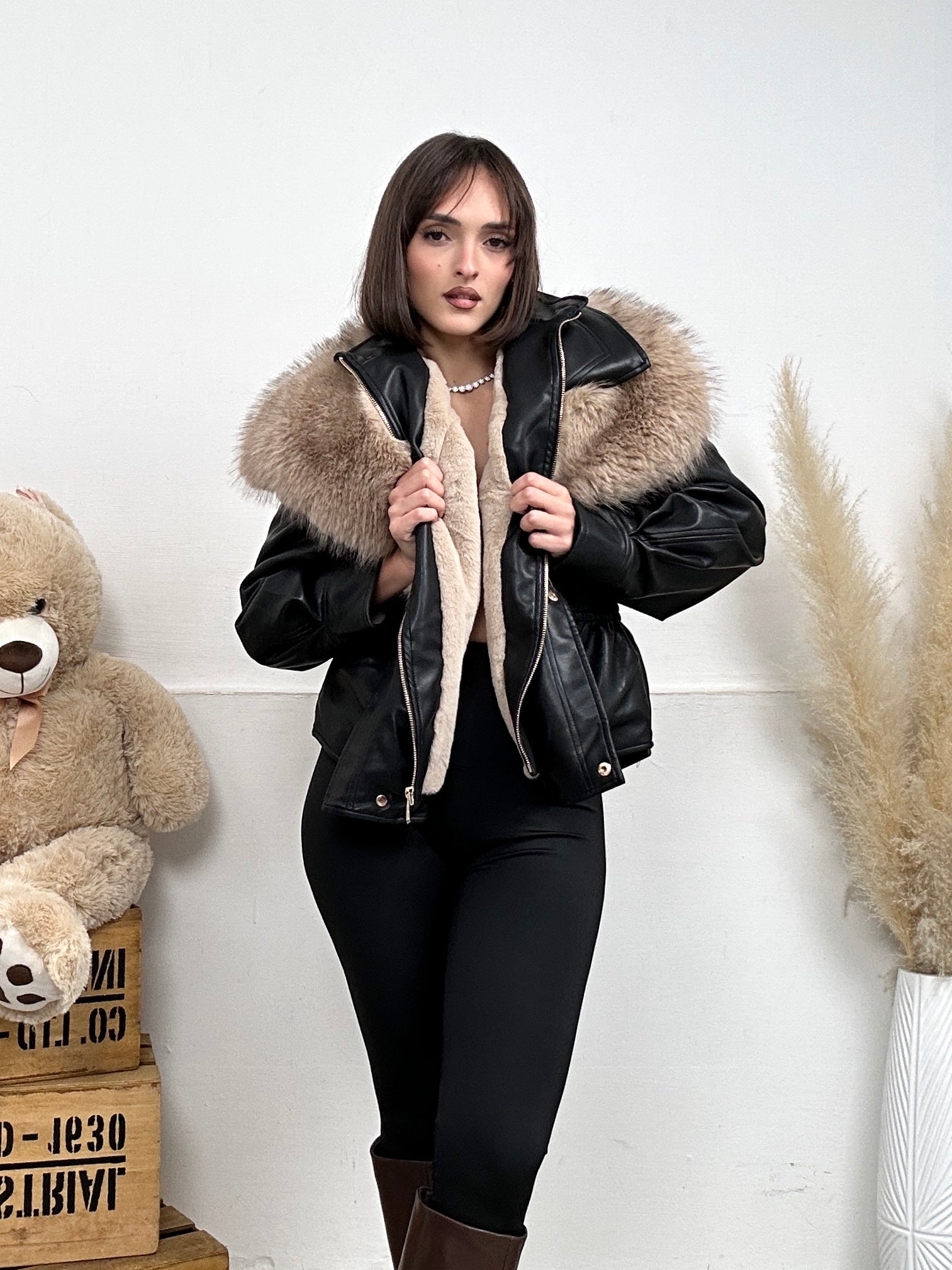 Giubbino PELLY, in ecopelle con colletto con pelliccia removibile ed è presente anche all'interno con chiusura con zip.