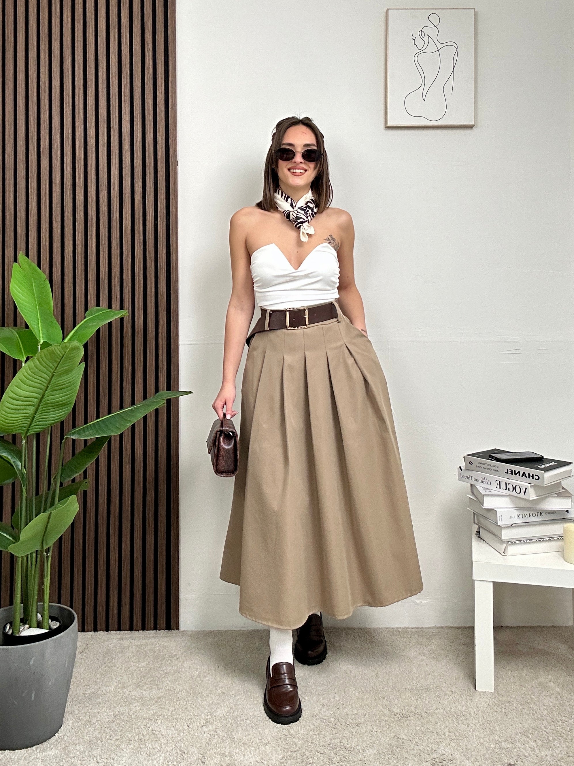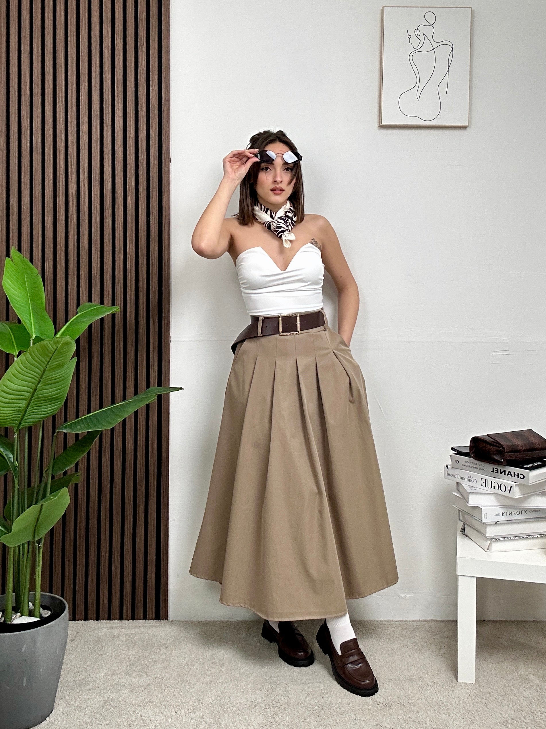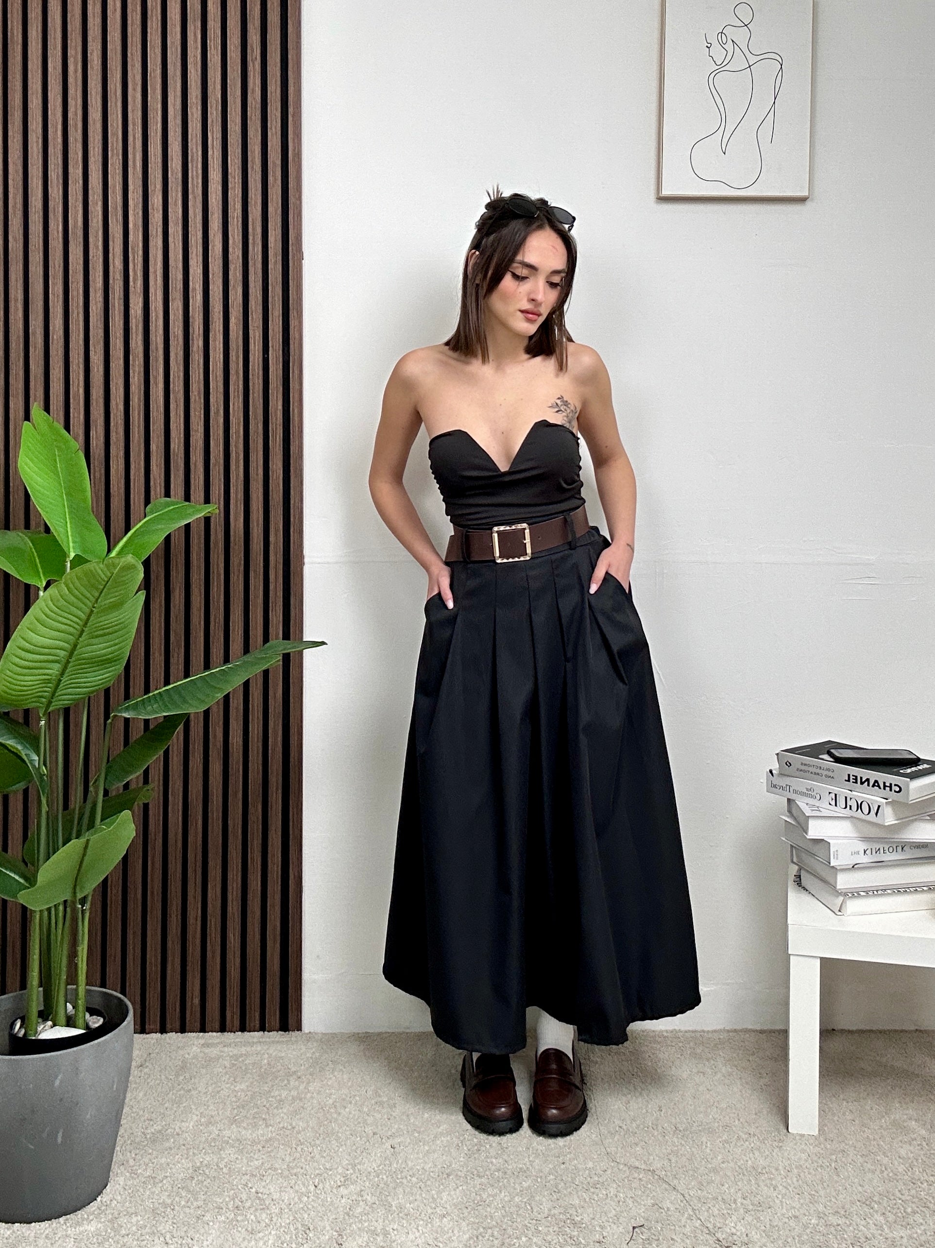 Gonna Lunga, plissettata, elasticizzata con chiusura con cintura in vita.