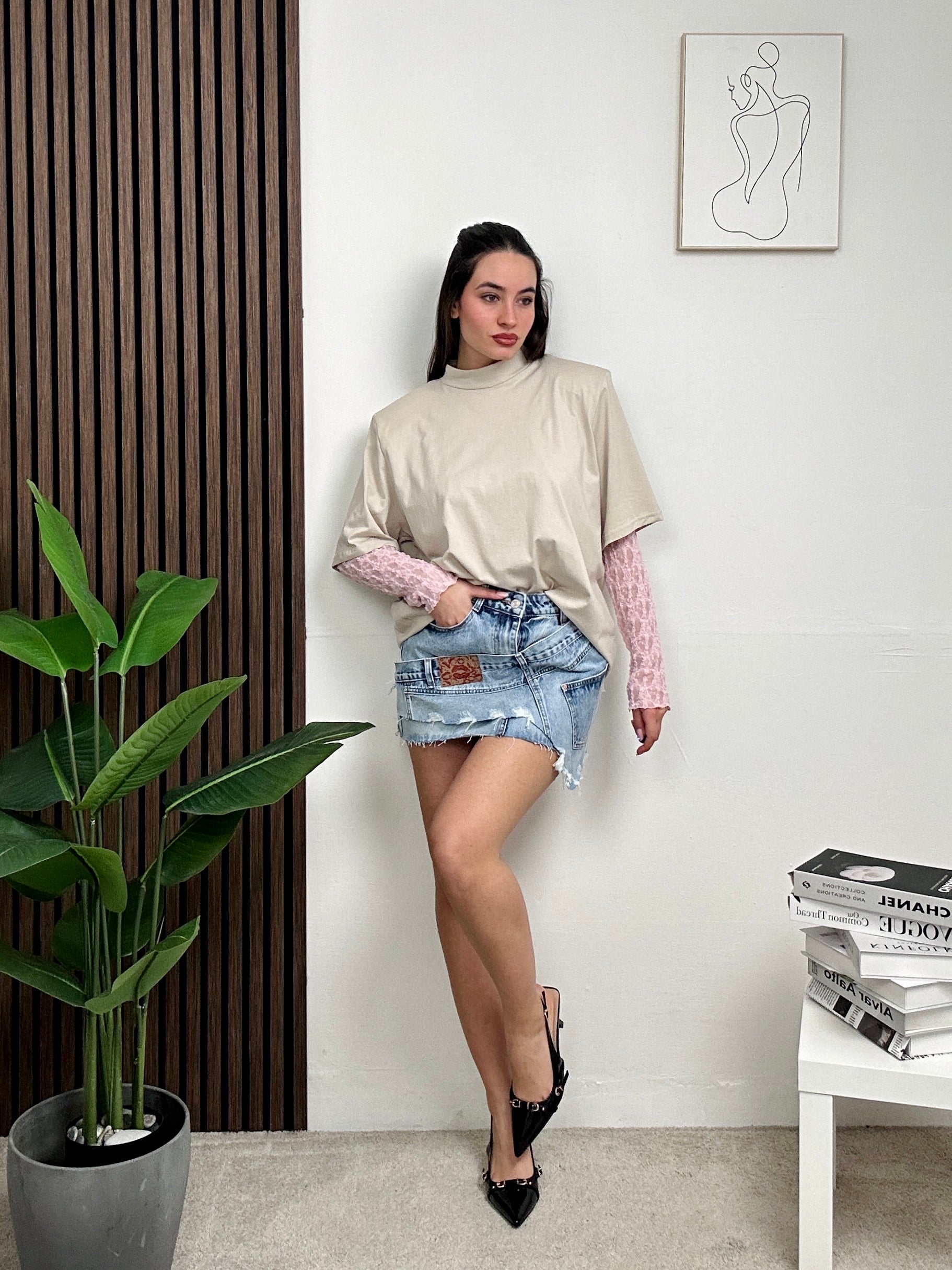 Gonna DENIM, corta con pantaloncino sotto, elasticizzata con incrocio frontale e tasche sia frontali che dietro.