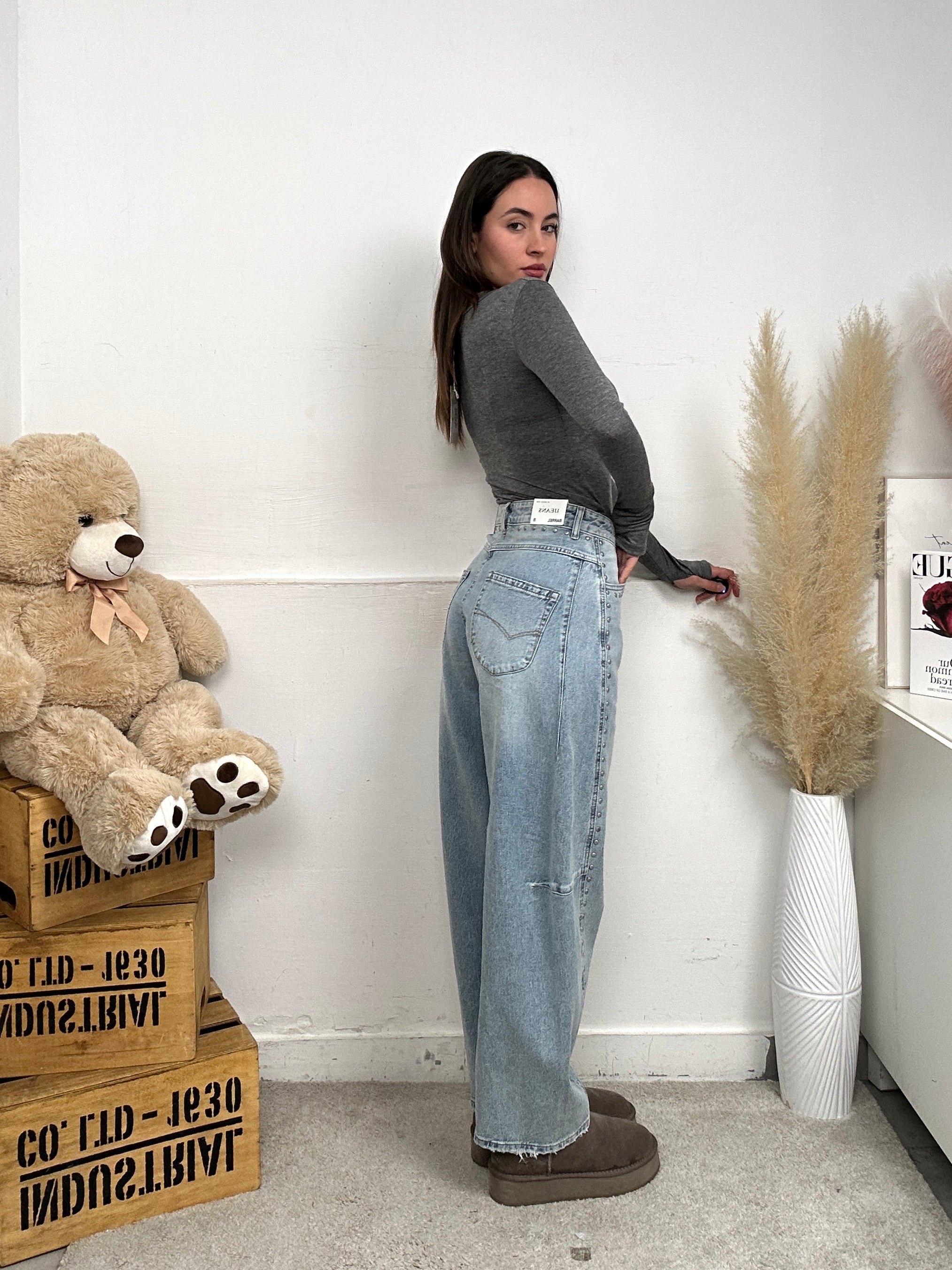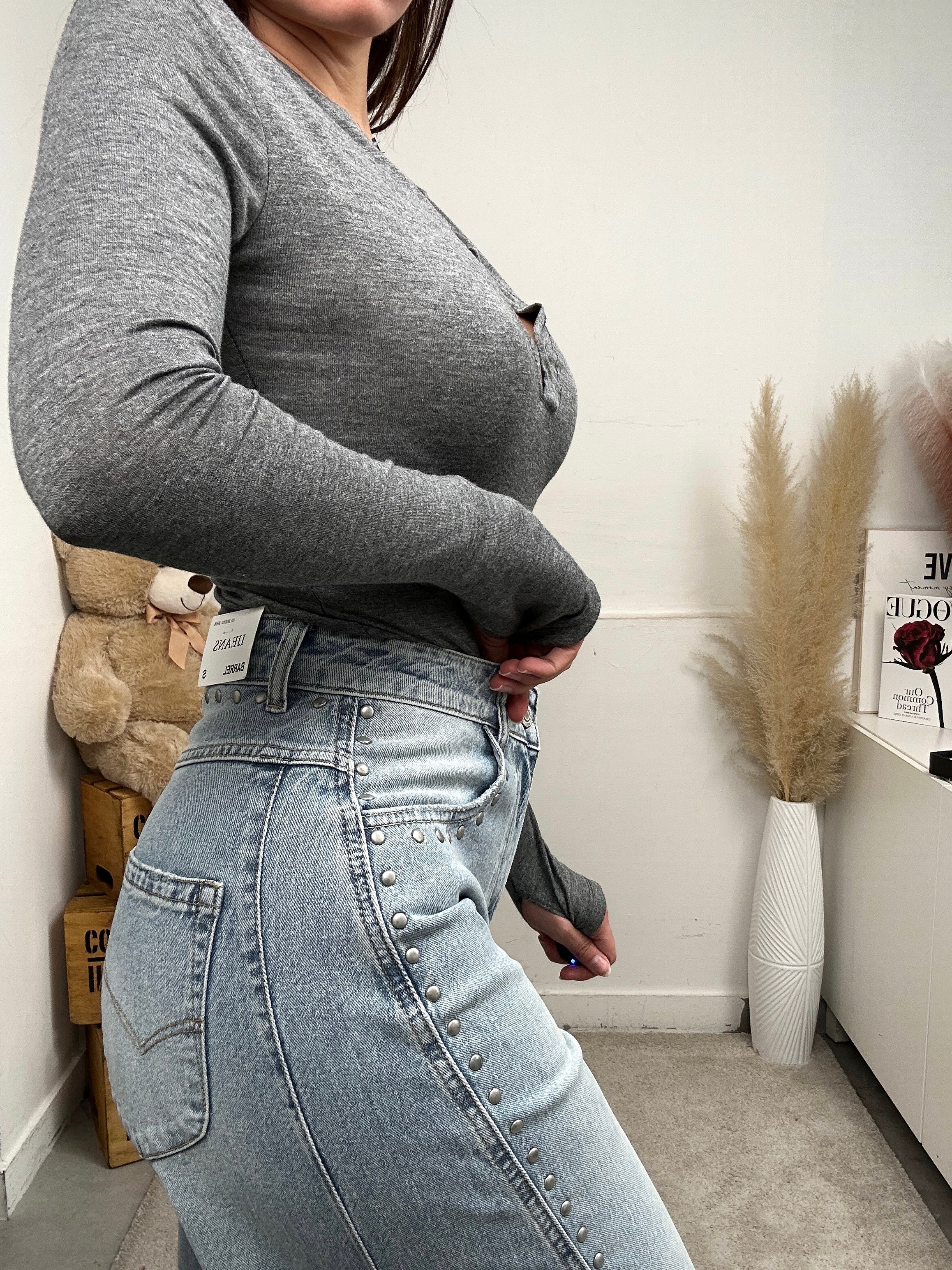 Jeans a balloon, semplice, comodo e elasticizzato, con tasche sia frontali che dietro, chiusura con bottone e zip frontale e tante borchie lateralmente.