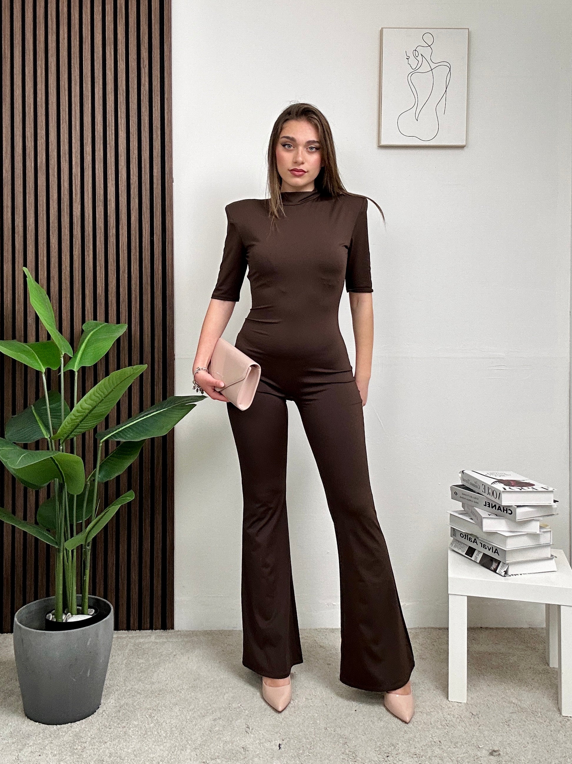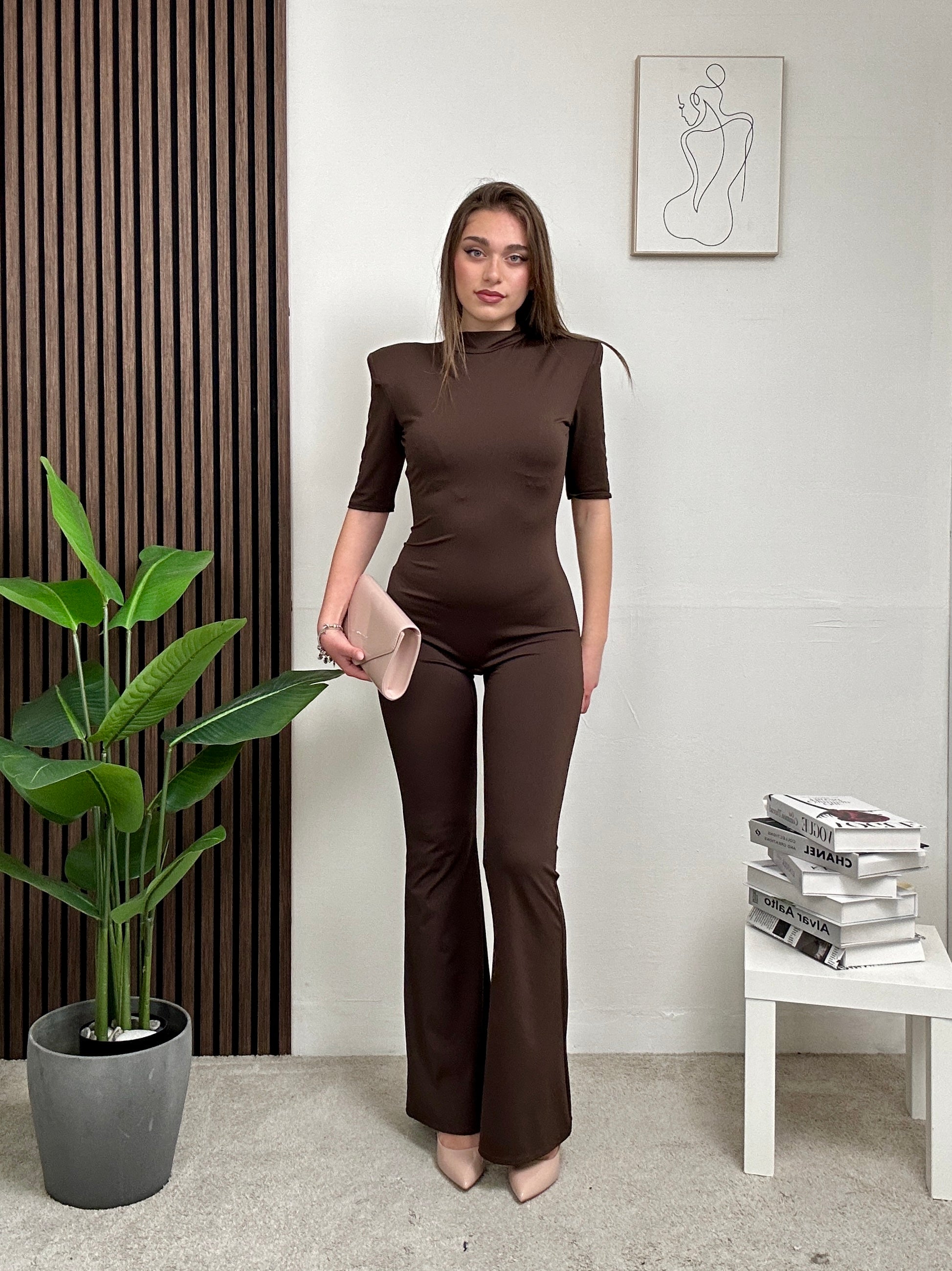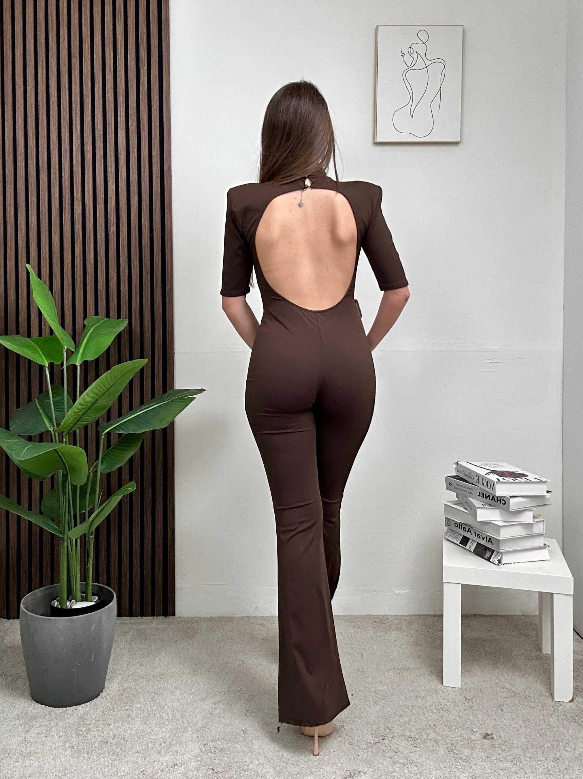 Jumpsuite MARTINA, in lycra, con pantalone a zampa, aderente, a maniche corte, spalline imbottite, schiena scoperta e chiusura con bottoni dietro al collo.