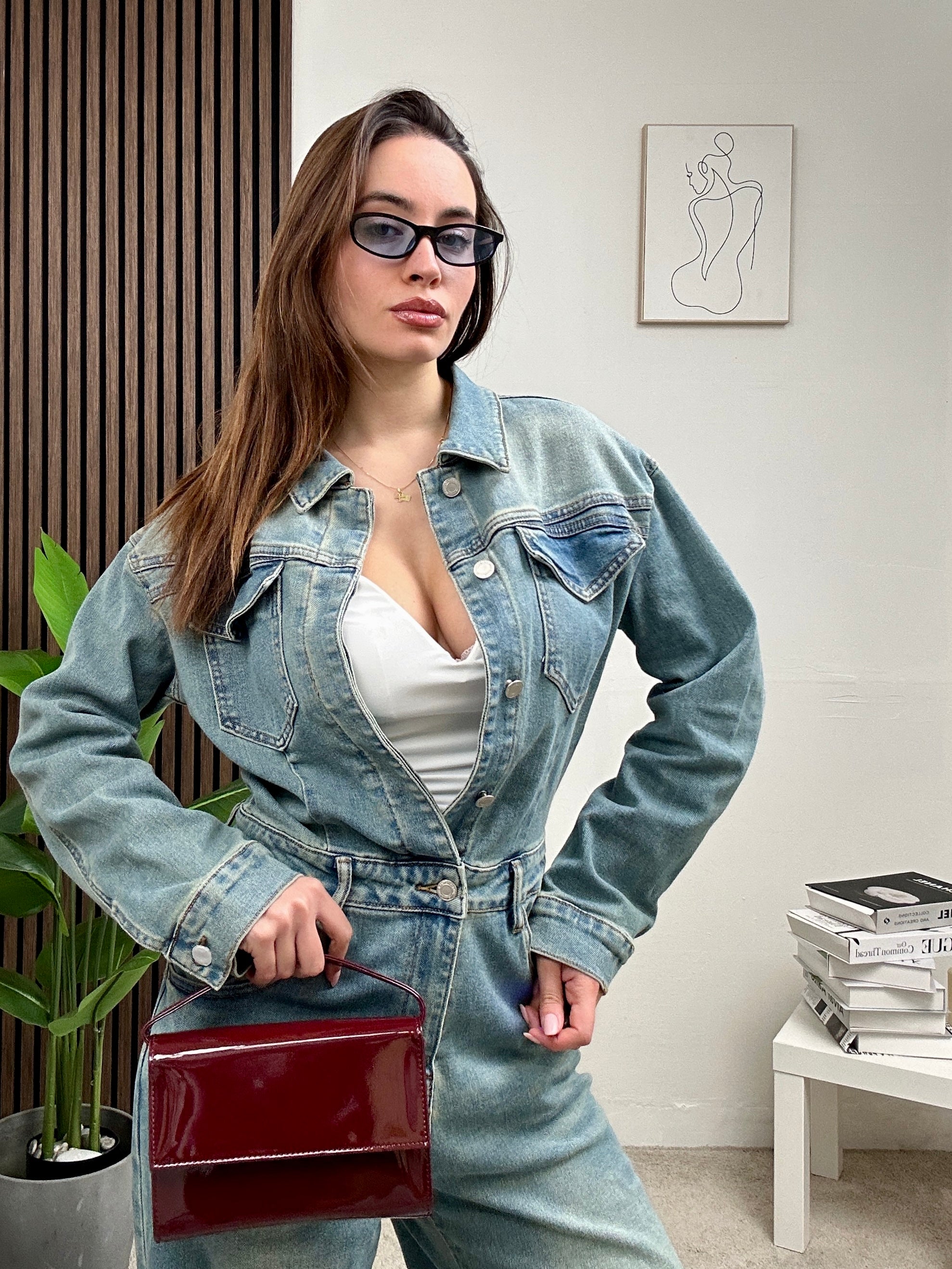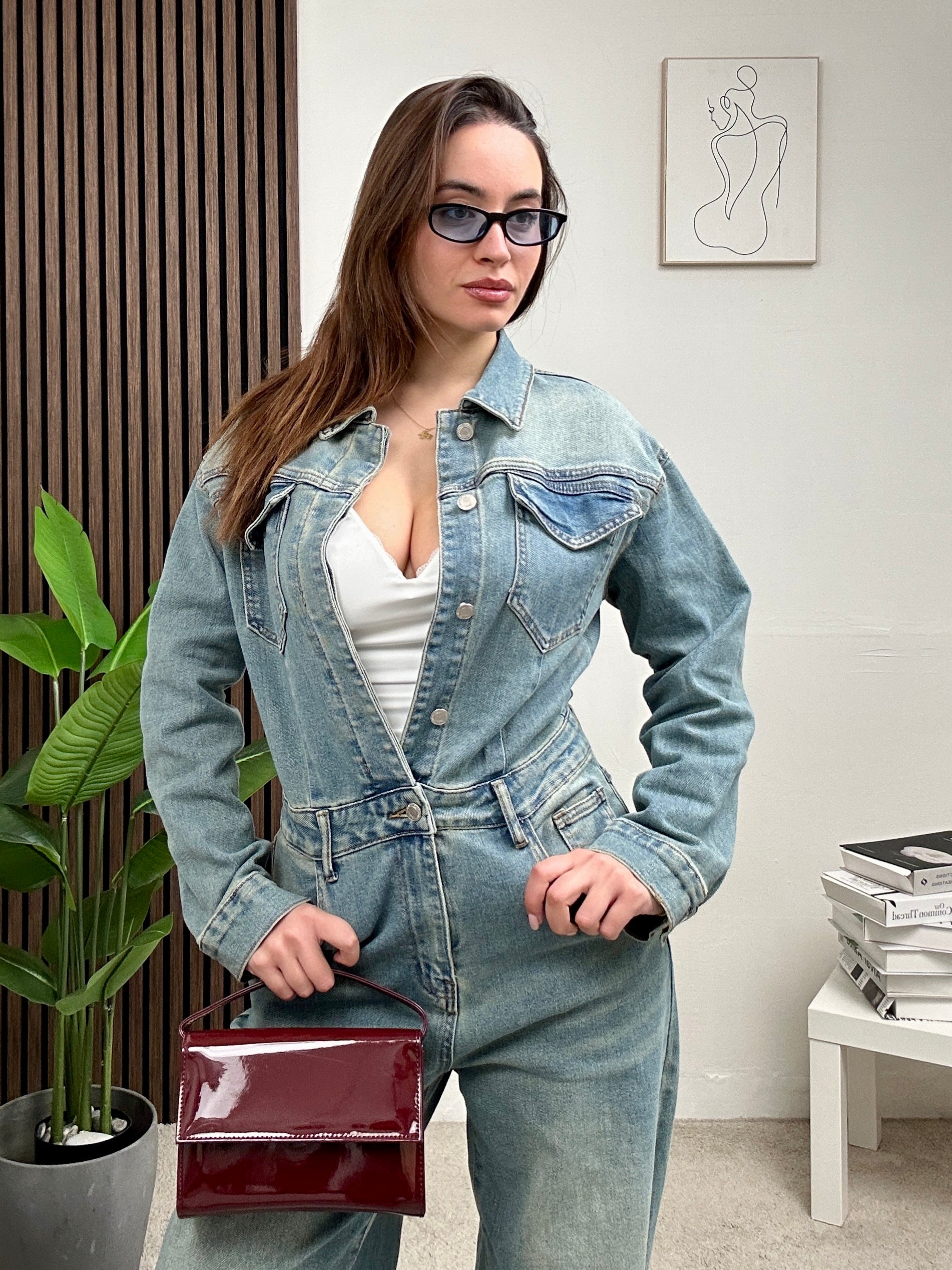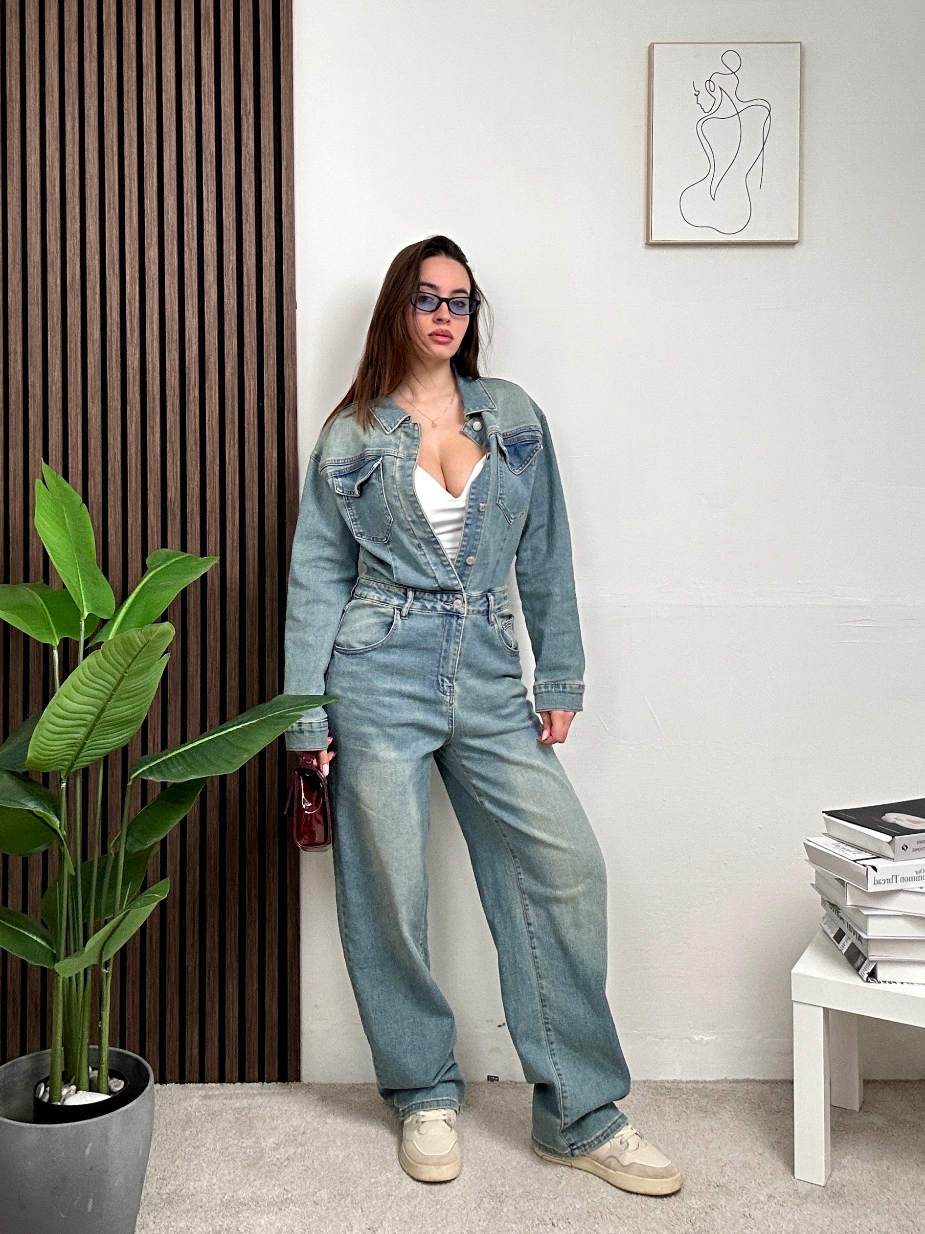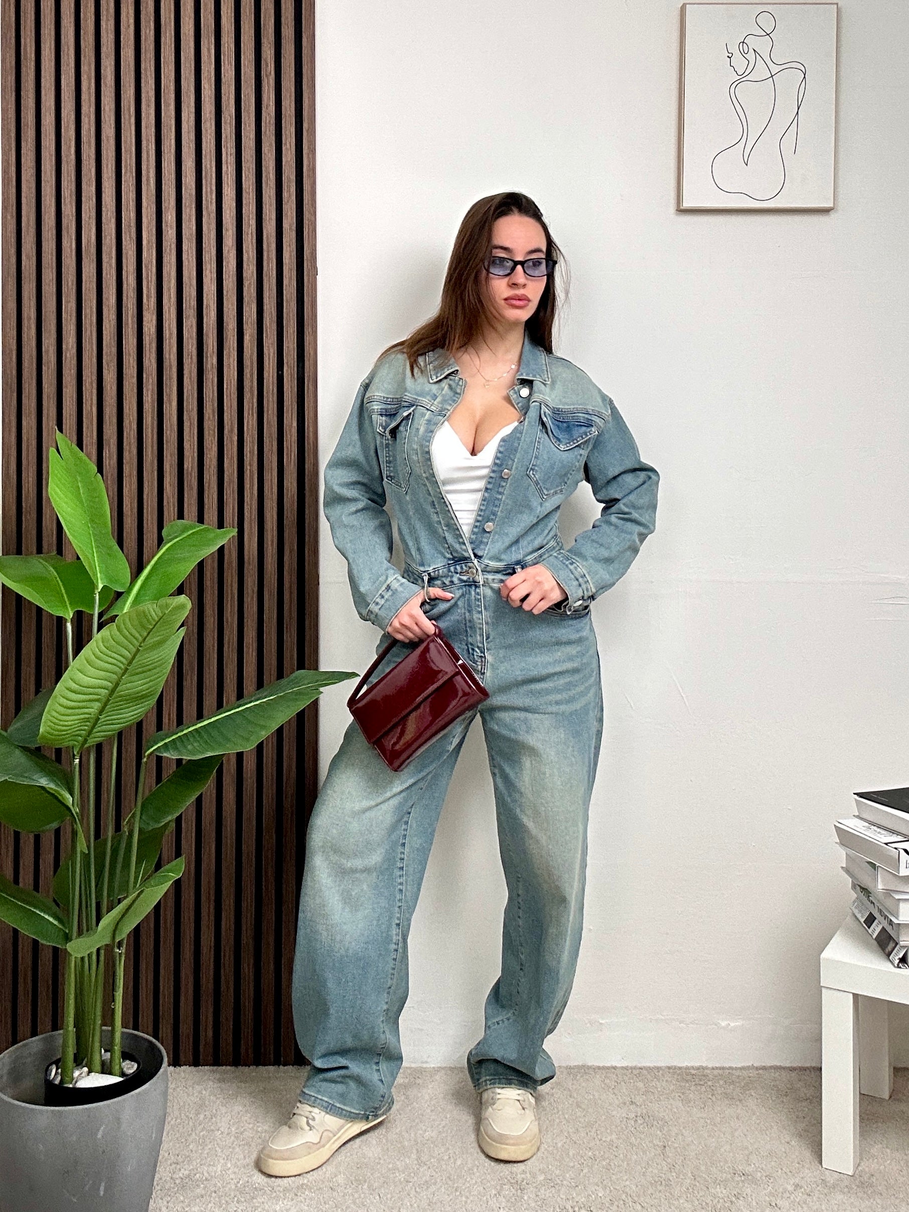 Tuta intera in denim dal fit morbido e contemporaneo, perfetta per un look casual ma ricercato. Il design con chiusura frontale e punto vita definito valorizza la silhouette, mentre il taglio wide-leg dona comfort e stile. Ideale da abbinare a sneakers per il giorno o a tacchi e accessori per un outfit più deciso. Un capo versatile e di tendenza per ogni stagione.