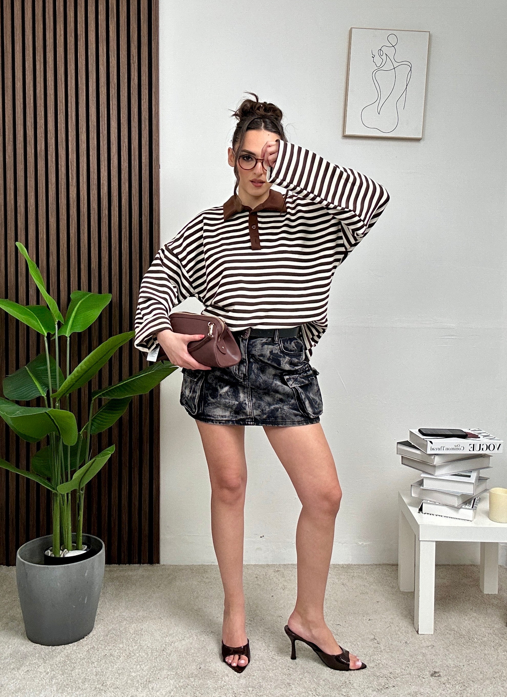 Maglia a righe, lunga oversize a maniche lunghe con colletto e chiusura con bottoni frontali.