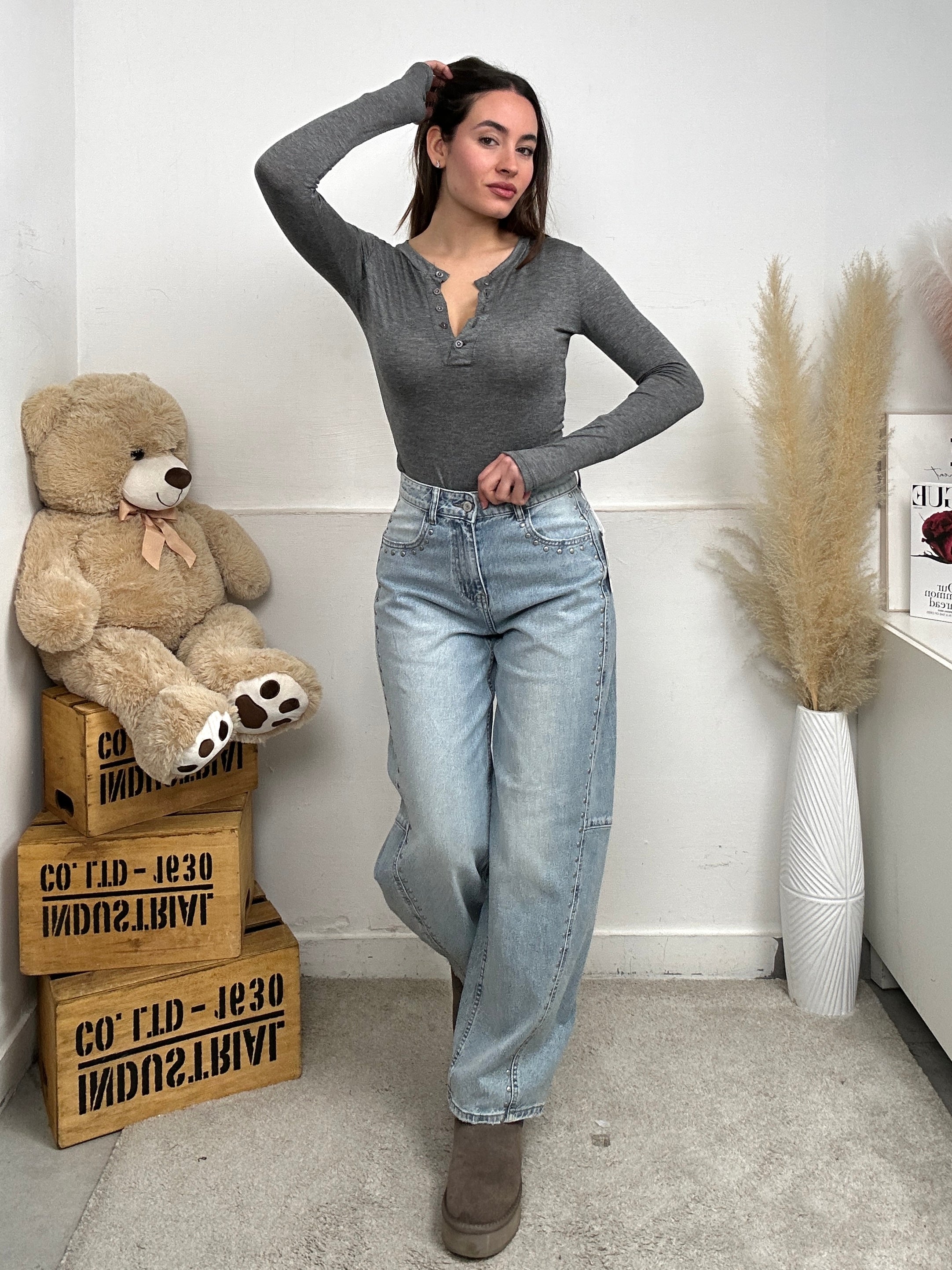 Maglia EASY, a maniche lunghe con fessura per il pollice ad uso guanto, scollo rotondo e chiusura con bottoni frontale.