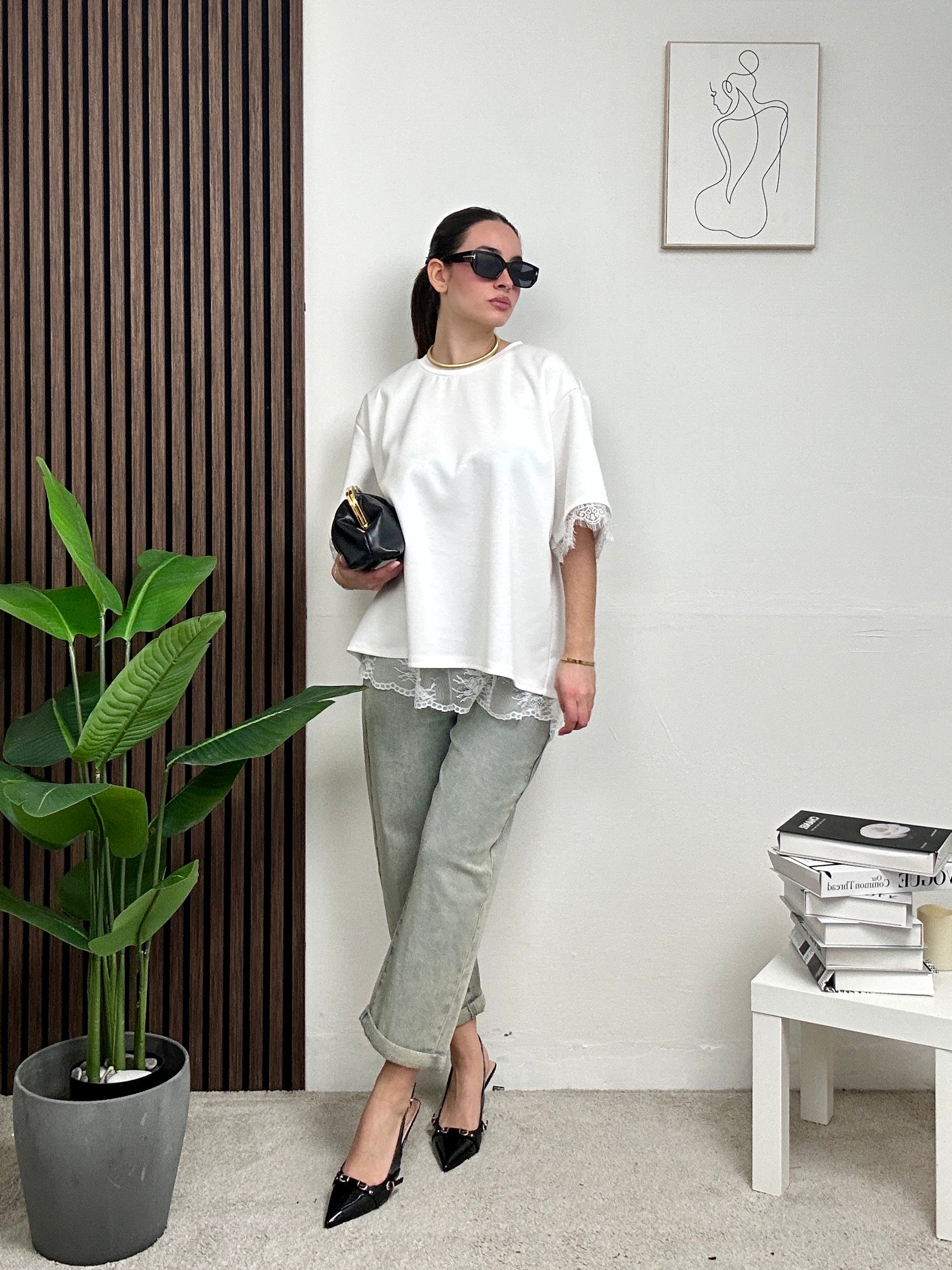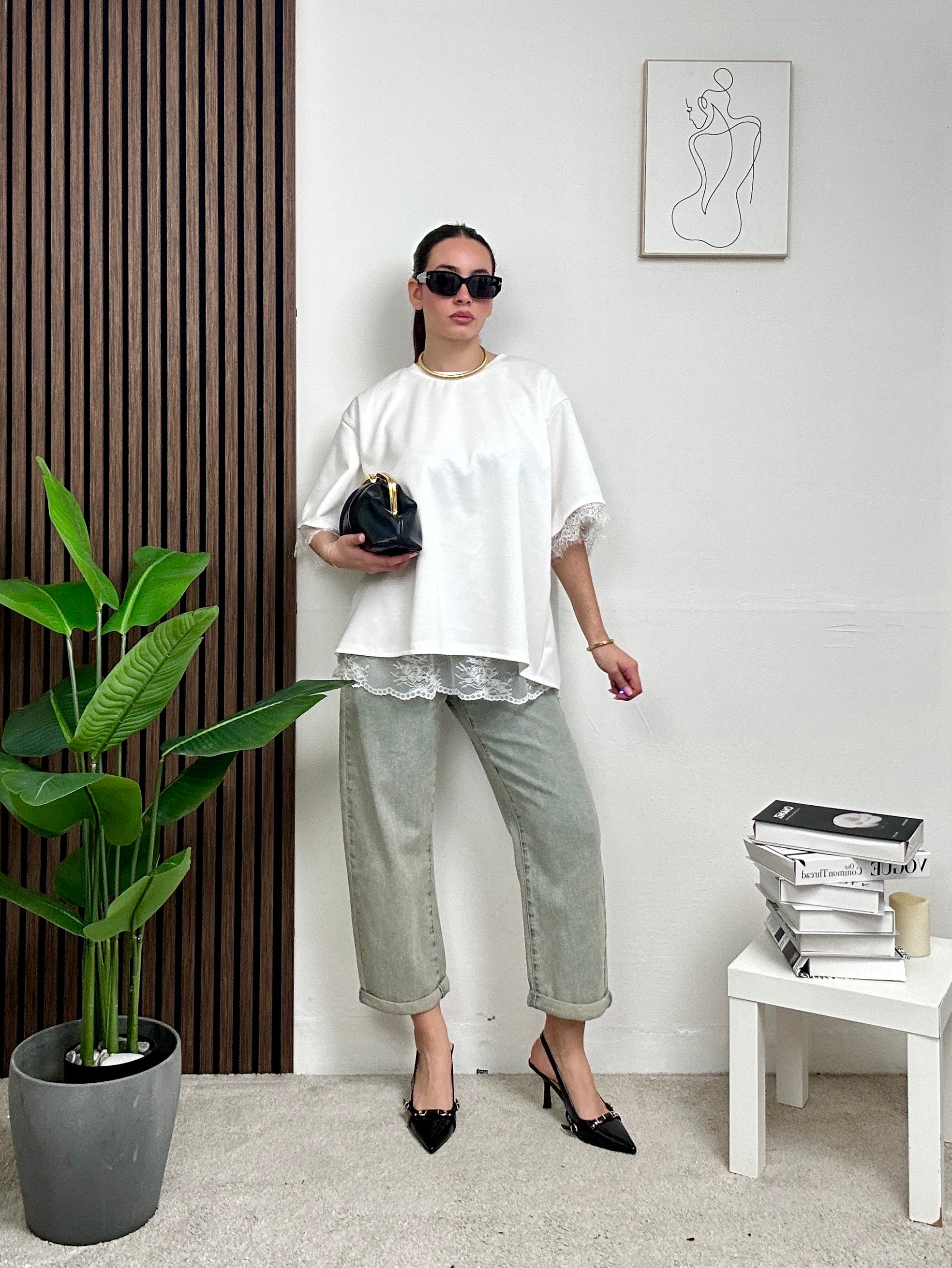 Maglia LEYLA, lunga e oversize con scollo rotondo, a maniche corte con apertura dietro la schiena che fuoriesce il ricamo in pizzo floreale e pizzo anche sull’orlo finale della maglia e delle maniche.