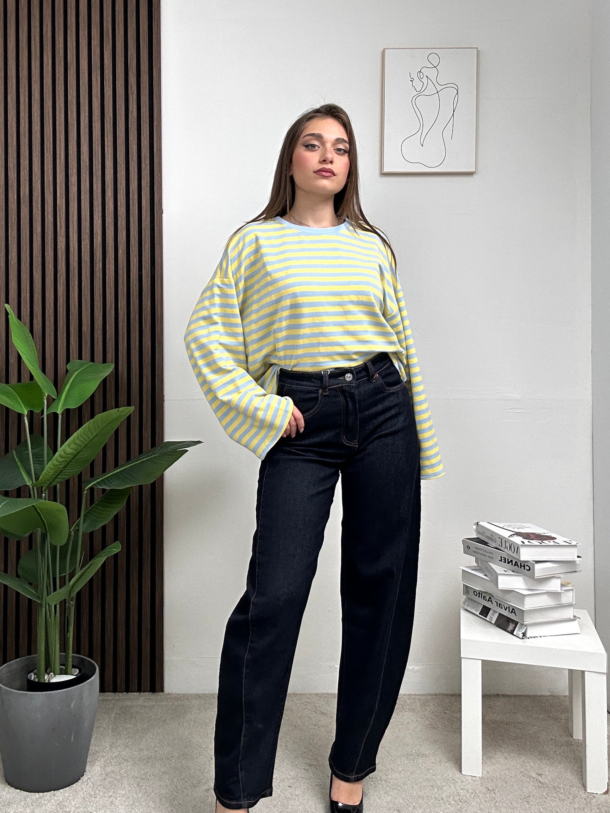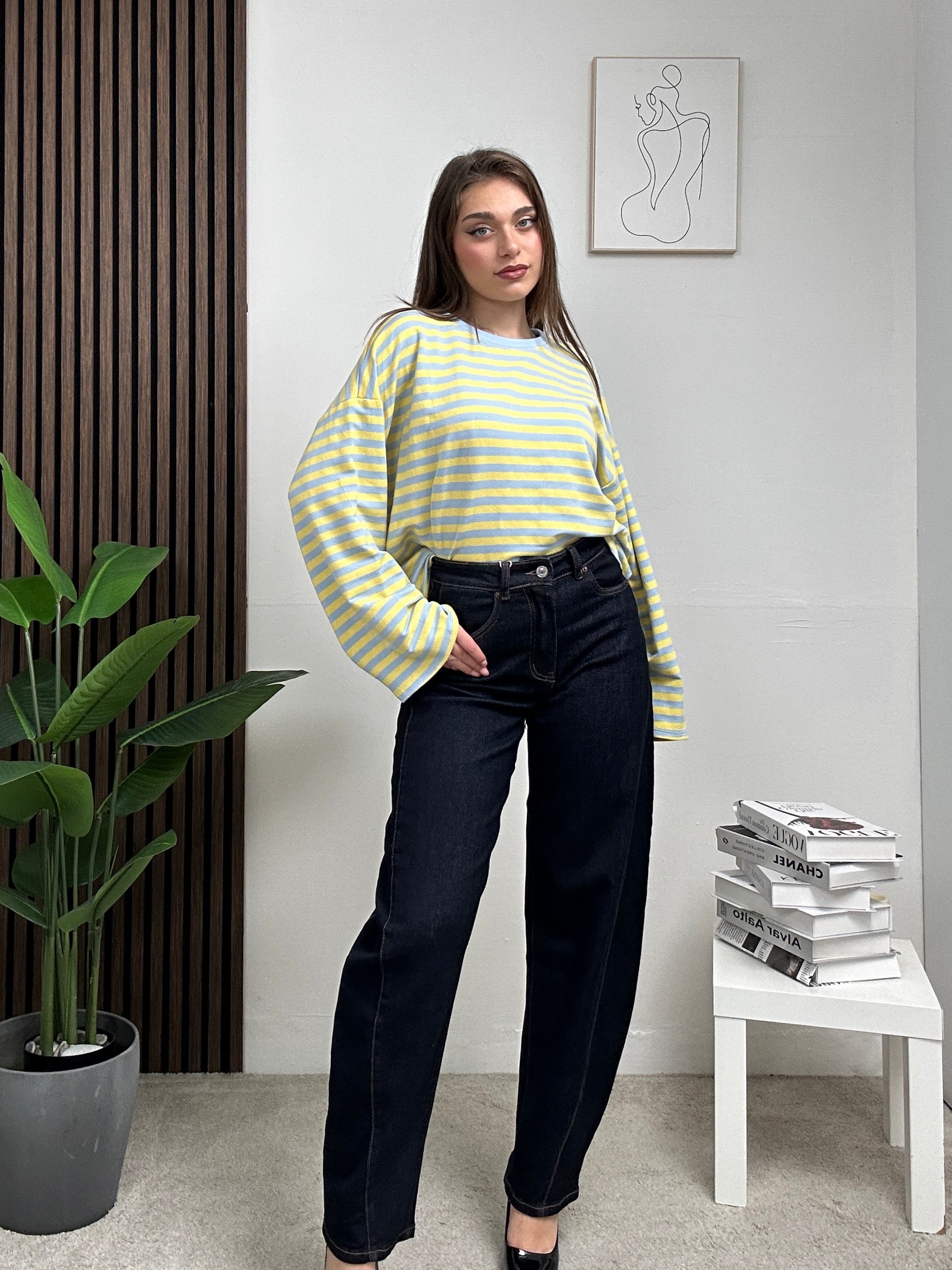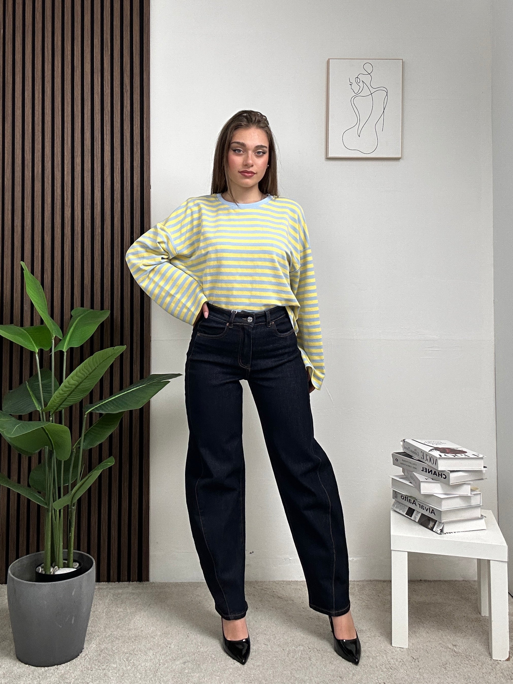 Maglia a Righe, lunga, oversize con scollo rotondo a maniche lunghe.