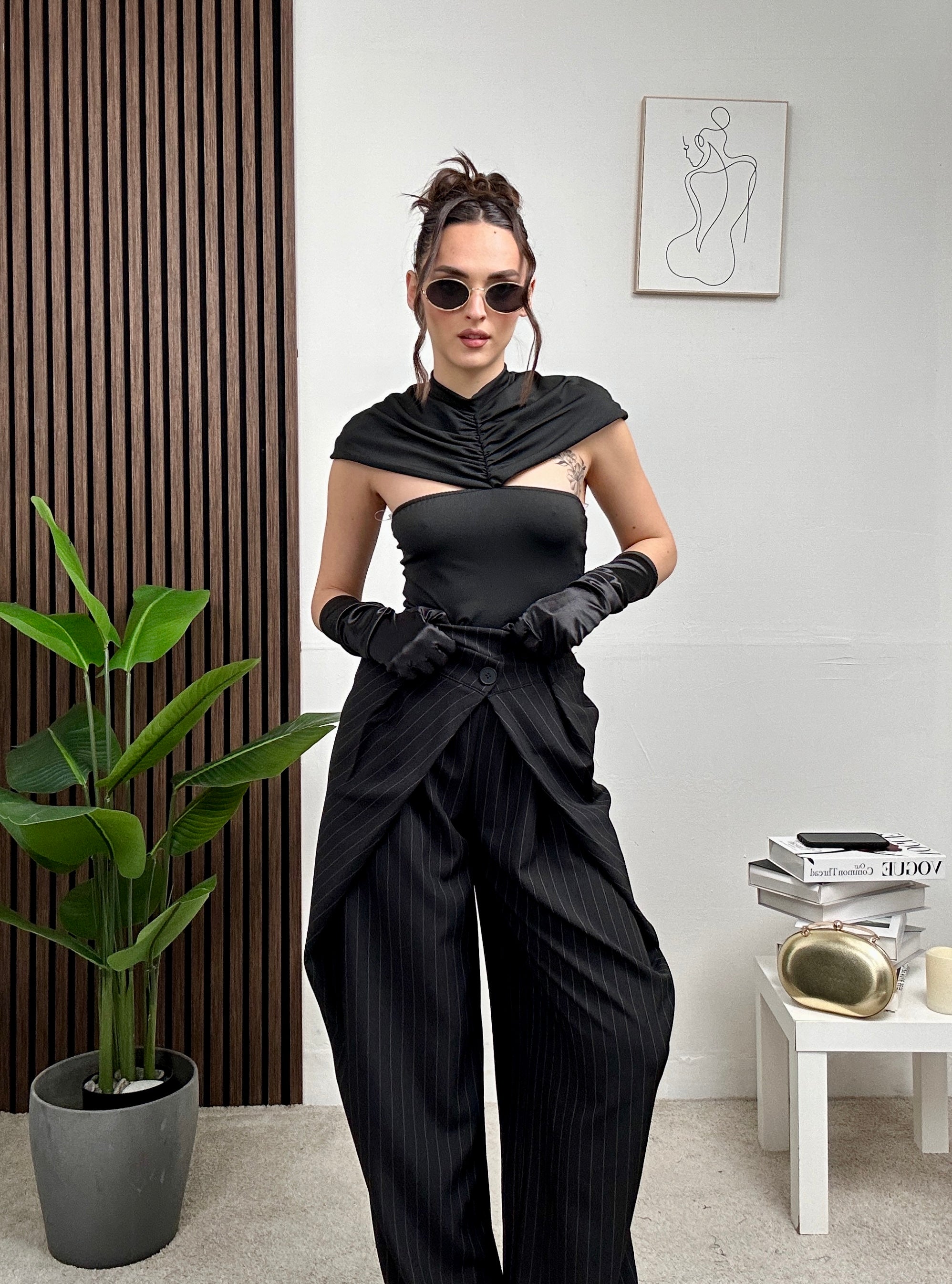 Pantalone a RIGHE, lungo a balloon con dettaglio particolare sul davanti e chiusura con bottone e zip frontale con tasche laterali.