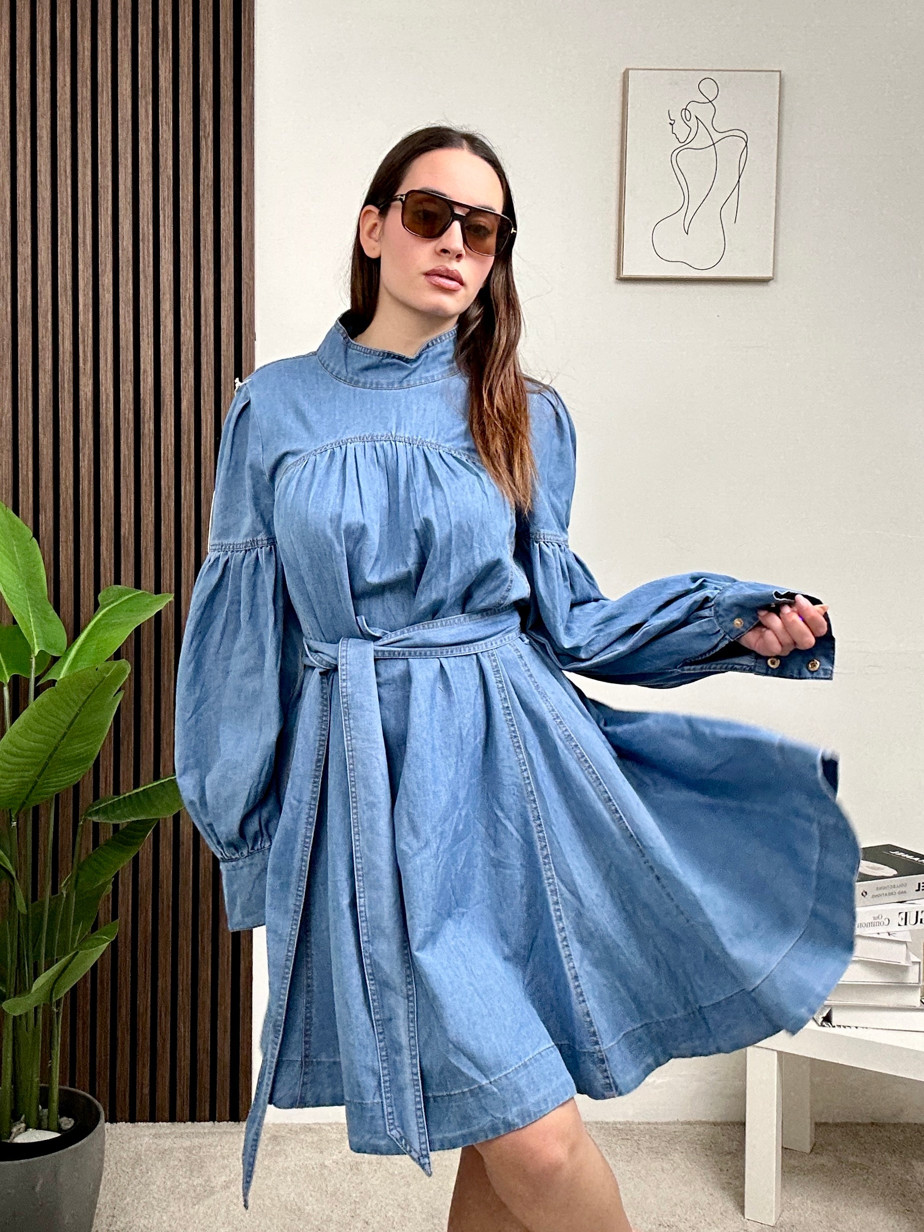 Abito in denim leggero con collo alto e maniche ampie dal volume romantico. Vita definita con cintura coordinata e gonna svasata che dona movimento e femminilità. Perfetto per look casual chic dal carattere moderno.